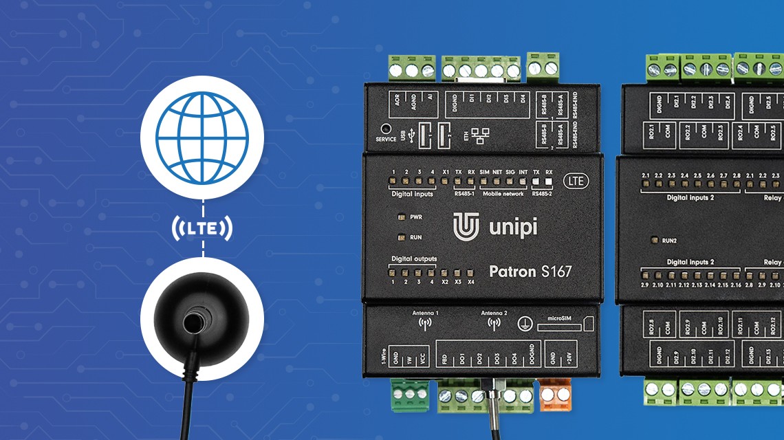 Tři nové modely Unipi Patron jsou vybaveny LTE modemem a slotem pro microSIM, které umožňují připojit PLC k internetu prostřednictvím bezdrátové LTE sítě. Kontrolér také může odesílat a přijímat SMS.