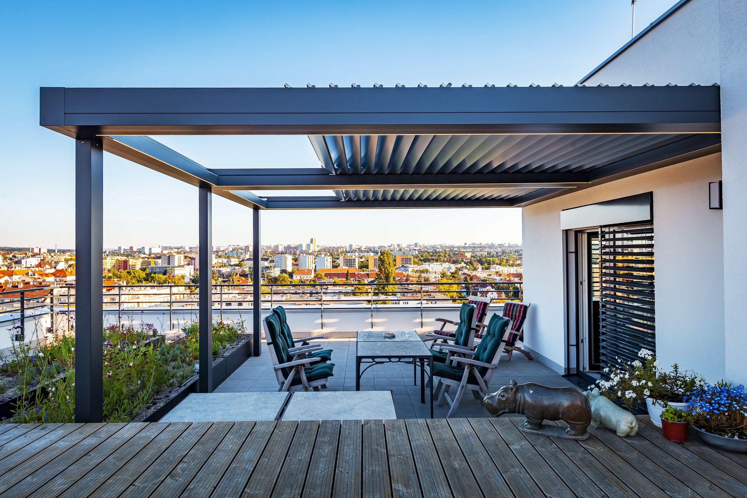 Italský design v antracitové barvě krásně ladí s venkovními žaluziemi typu Z, které jsme manželům instalovali na okna bytu. Žaluzie i pergolu ovládají dálkovými ovladači.