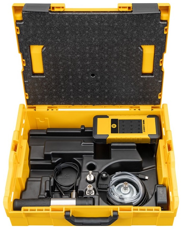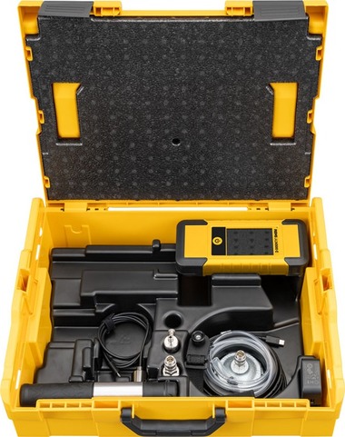 Elektronický přístroj pro tlakové zkoušky a zkoušky těsnosti s funkcí Connected přes Bluetooth, hadice na stlačený vzduch Ø 5 mm, průhledná, 1 m dlouhá, s bajonetovým uzávěrem a silikonovou objímkou, přípojka vzduchové pumpy s ventilkem Schrader ≤ 150 hPa/mbar, elektronický tlakový senzor ≤ 0,35 MPa/3,5 bar, adaptér R ½" vnější závit na rychlospojku DN 5, krytka pro jednotrubkový měřič G 2" vnitřní závit (pro DN 25), ruční vzduchová pumpa, upevňovací sada, USB kabel, zdroj napětí/nabíječka 100–240V. V kufru systému L-Boxx.