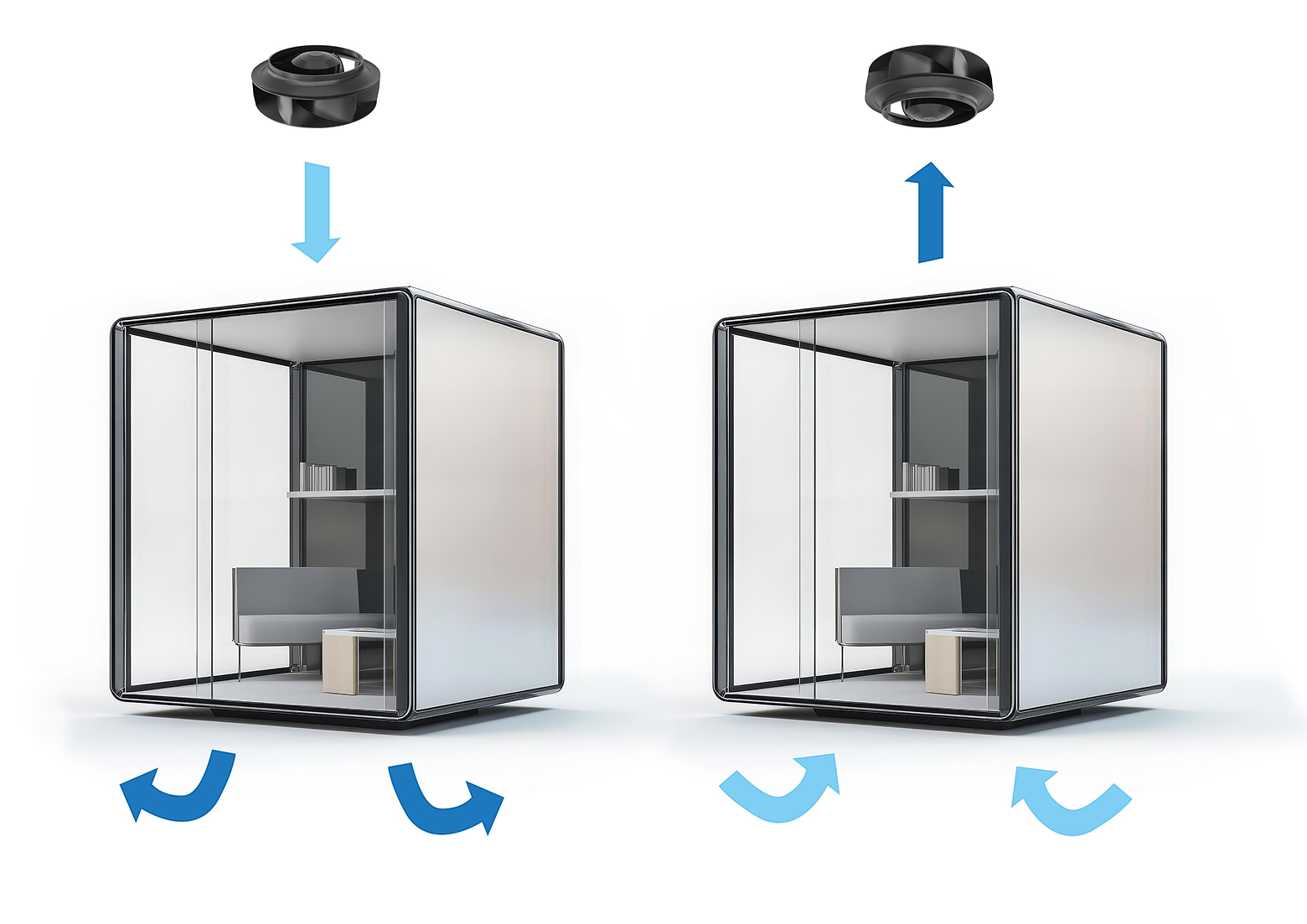 Aby plnily svou funkci – tedy poskytovaly klid a zvukovou izolaci – musí mít nejen kvalitní výplň, ale i správně navržené větrání. V malé a uzavřené kabině může rychle stoupnout koncentrace CO2, vlhkost i teplota, což negativně ovlivňuje soustředění a pohodu uživatele.