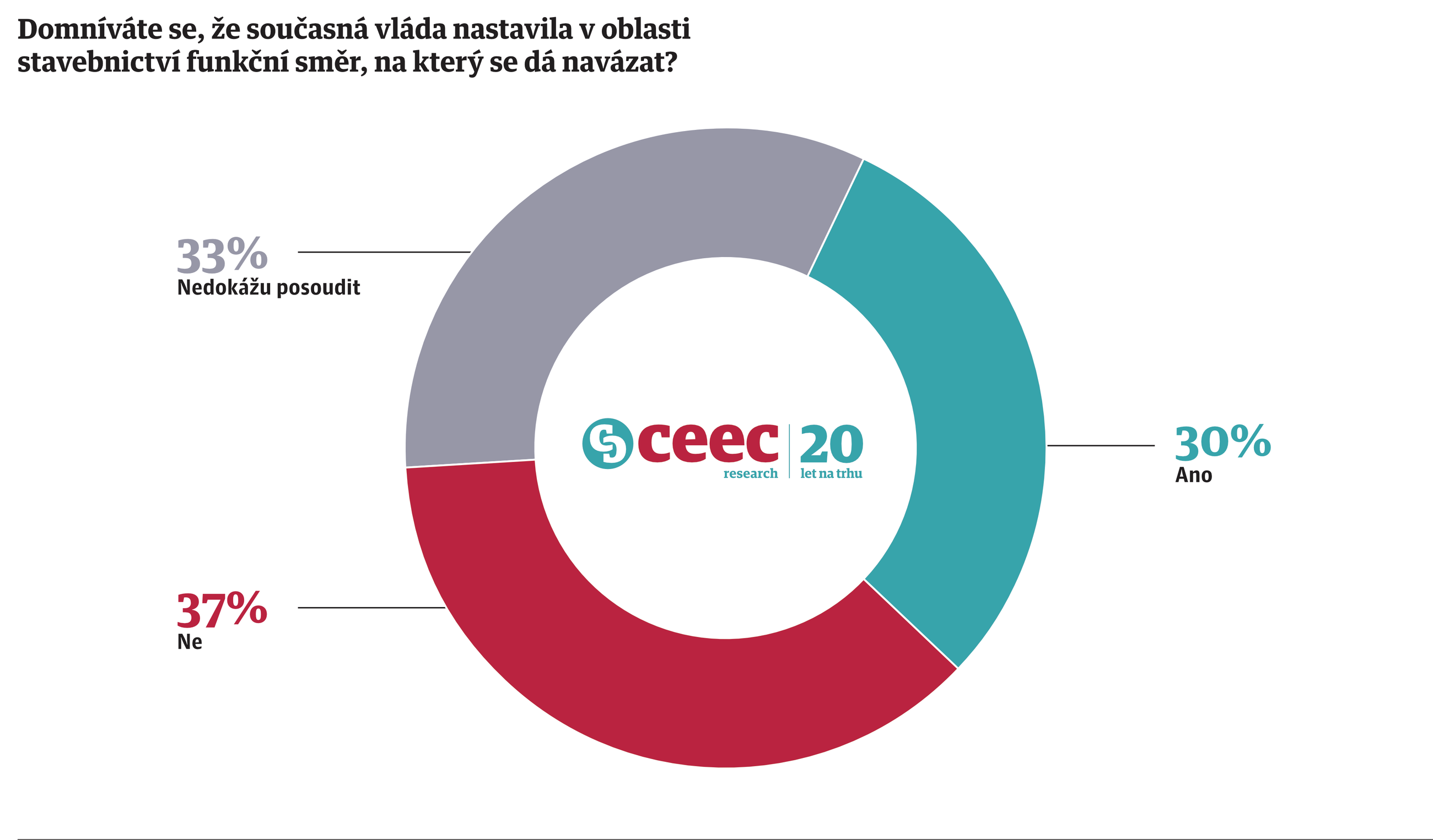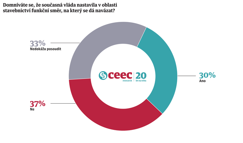 Na otázku, jak firmy hodnotí přístup k tvorbě stavebního zákona v minulém a současném volebním období, třetina respondentů (34 %) odpověděla, že nepovažuje za vhodný ani jeden z přístupů. Šestnáct procent firem označilo za lepší variantu stavební zákon připravovaný za vlády hnutí ANO ministryní Klárou Dostálovou, zatímco 13 % hodnotilo pozitivněji přístup současné vlády.