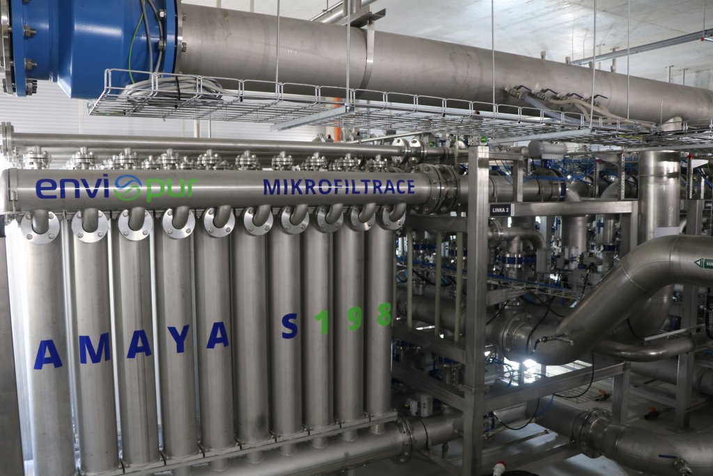 Úpravna vody v Hrobicích má kapacitu až 200 l/s a dva hlavní zdroje, z nichž čerpá vodu. Nádrž Oplatil čerpá povrchovou vodu a má vrty v prameništích Hrobice a Čeperka. Voda z nádrže Oplatil má nestálou kvalitu a často se v ní vyskytují organické látky, mikroorganismy a fytoplankton. Membránová technologie Amaya plně nahradila stávající technologii a dokázala zde odstranit veškeré mikroorganismy. Z podzemních vrtů se pomocí lamelových separátorů a pískových filtrů odstraňuje železo a mangan. Smíchaná voda následně projde ozonizací, chloriazací a přes UV lampu, tím se z ní odstraní pesticidy,“ dodal Pavel Dobiáš na exkurzi a nabídl k prostudování celý projekt Úpravny vod Hrabice [4].