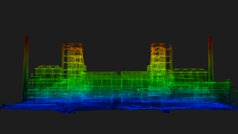 Render 3D mračna bodů vysokých pecí v Ostravě, vytvořený pomocí dat z dronu