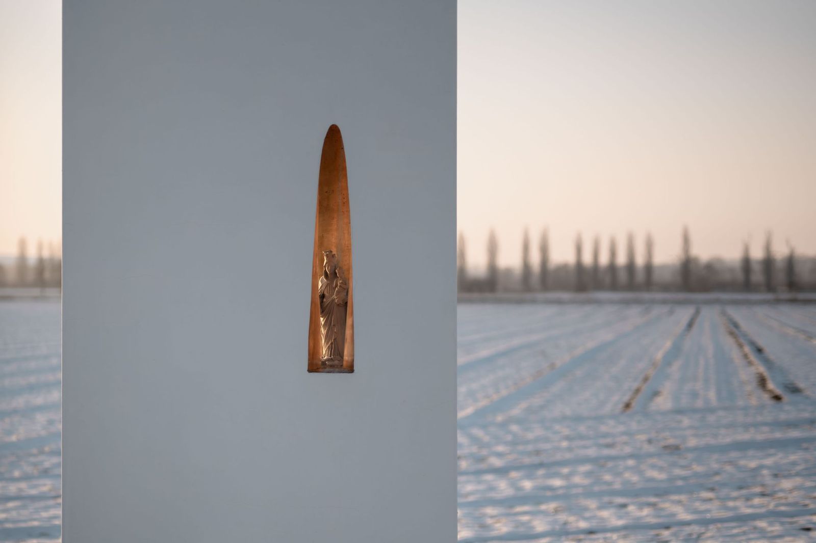 Stejně jako původní kaple je i ta nová zasvěcena Panně Marii. Její soška je umístěna v samotném nitru kaple, kde je chráněna před nepříznivými vlivy okolí. Soška je v kapli jakoby schovaná, schoulená – stejně jako se matka choulí ke svému miminku, aby jej ochránila a zahřála. Kolemjdoucí si k ní musí najít cestu, nespatří ji hned při prvním pohledu. Stejně tak si člověk musí najít cestu k víře, k duchu, k sobě samému. Na Pannu Marii rovněž nabízíme tři různé pohledy – z různých stran: jako na pannu, jako na matku a jako na světici. Tyto pohledy se pak setkávají v jednom – v jedné Panně Marii Na Pískách.