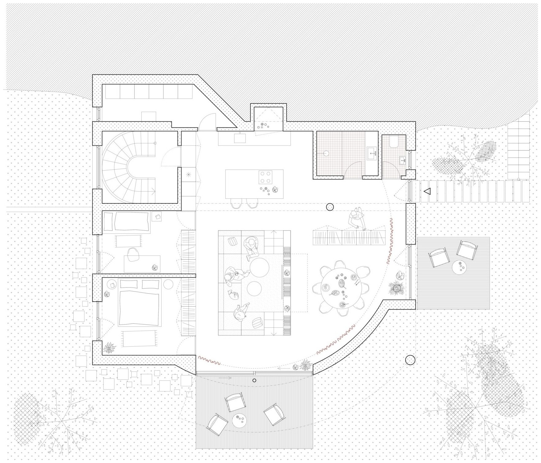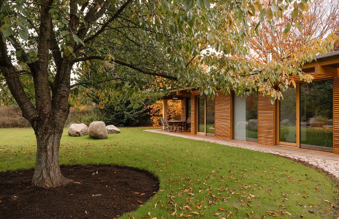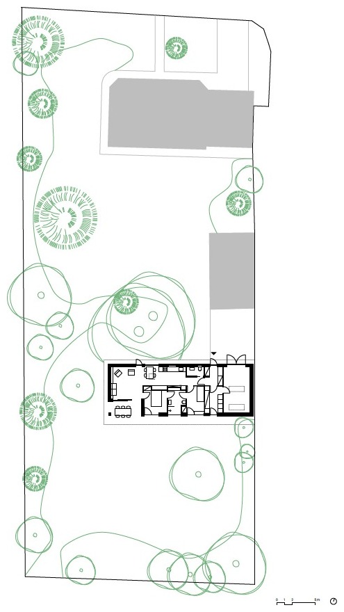 Obrázek 1: Zdařilým příkladem jednoduché výplňové stavby na pozemku rodinného domu je stavba výměnku, který pro své rodiče navrhnul architekt Vojtěch Malina. Výměnek je bezbariérový a propojený se zahradou. Situační výkres ukazuje umístění a orientaci výměnku vzhledem k původním stavbám na pozemku. Zdroj: https://vojtechmalina.com/, fotografie: Martin Faltejsek