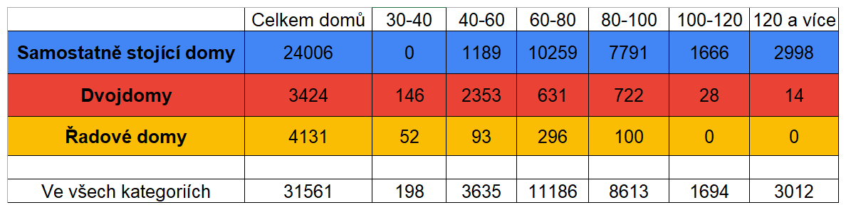 Rozložení velikostí rezervních prostorů v domech odpovídá na rozložení typologií individuálního bydlení, kdy největší prostorové rezervy logicky nabízejí plošně největší samostatné rodinné domy, zatímco u řadových domů je potenciál spíš pro menší jednotky (Tabulka 1).