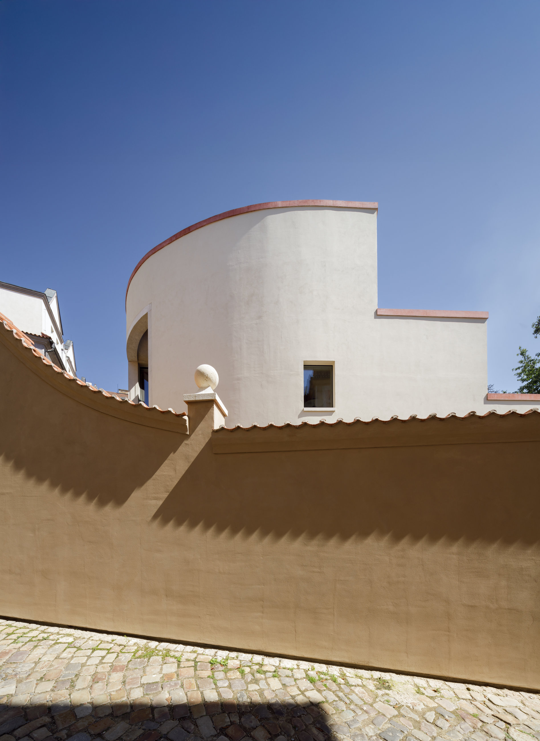Významnou součástí projektu se stala i obnova původní ohradní zdi, která jako jediná na pozemku podléhala památkové ochraně. Její technický stav byl ale natolik špatný, že nezbývalo než ji rozebrat a znovu vystavět ze stejných cihel. Možnosti recyklace stavebních materiálů jsou dnes velice aktuálním tématem, které zděné stavby staví do nových pozic z hlediska celistvě pojímané udržitelnosti v architektuře. „Nová zeď má stejnou výšku i proporce jako původní a dotváří uzavřený charakter pozemku se zahradou. Dům za ní působí nenápadně a neruší okolní zástavbu, takže do prostředí Malé Strany zapadá zcela přirozeně,” dodává profesor Lábus.