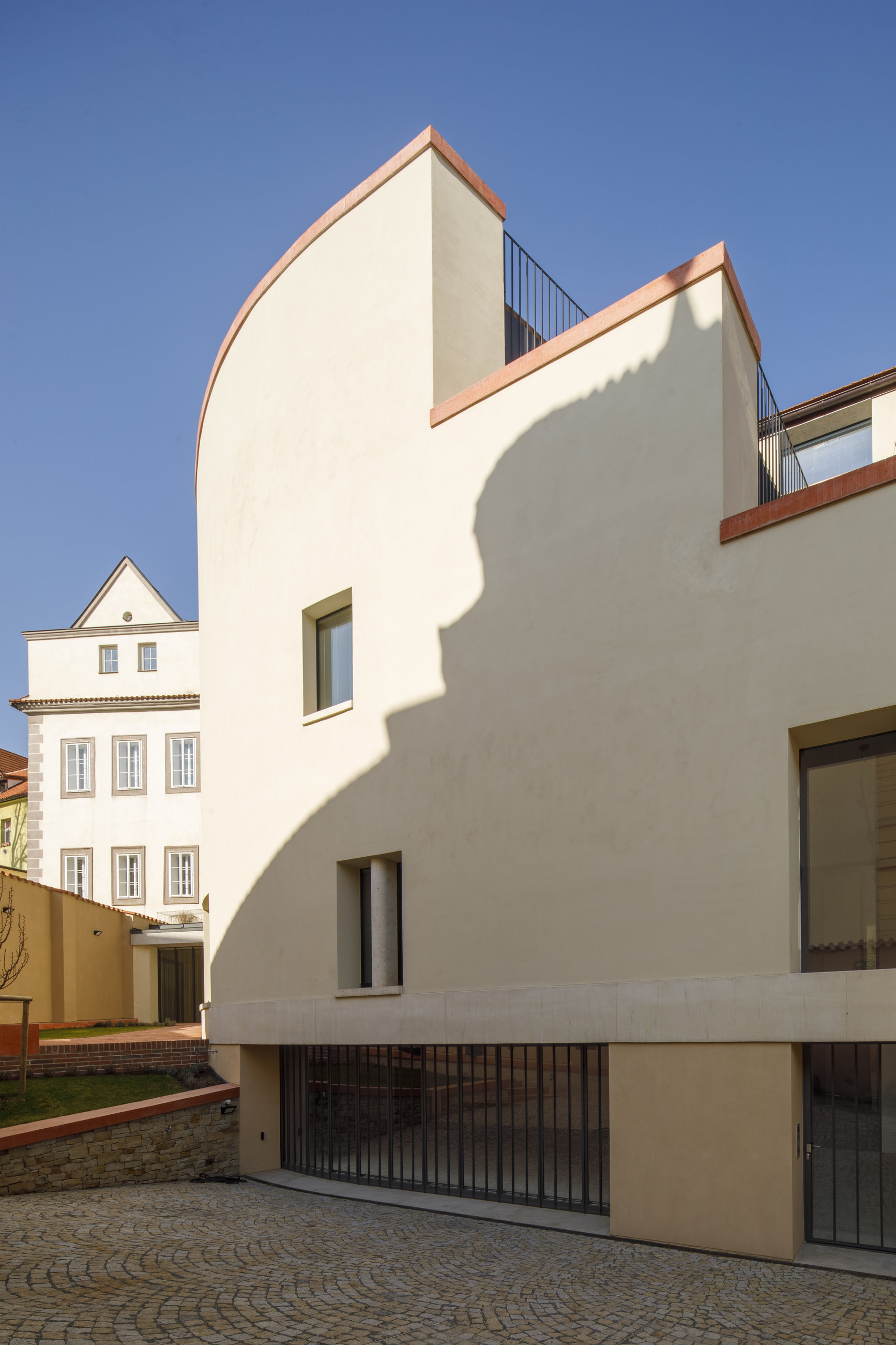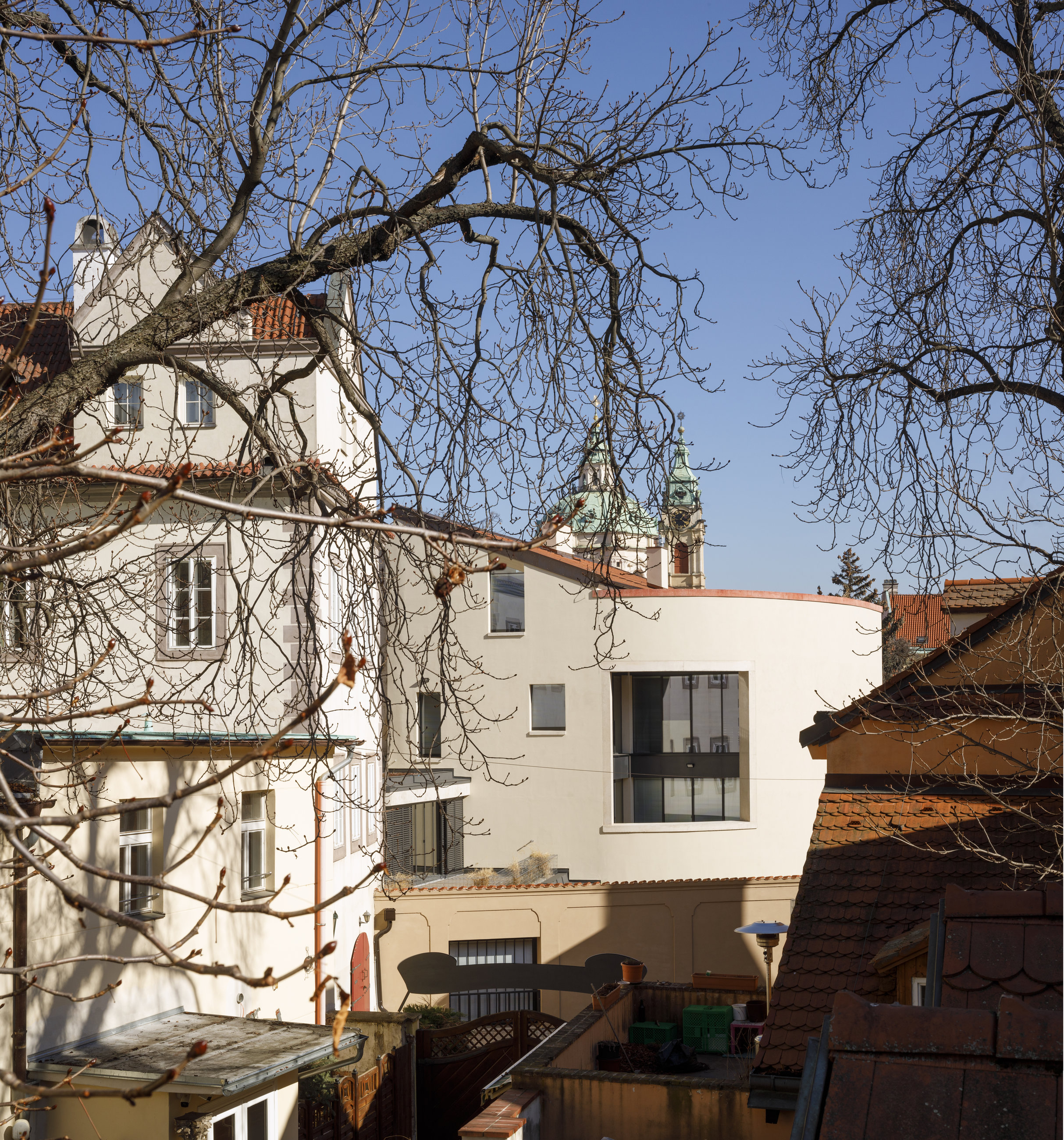 „Světlo prostupuje domem i díky řešení prostoru schodiště s proskleným výtahem a proskleným stěnám orientovaným na terasy nebo do dvoupodlažní lodžie, které otevírají výhledy z interiéru směrem na okolní historickou zástavbu až po panorama Strahovského kláštera. Hledali jsme kompromis mezi relativní uzavřeností historických staveb a otevřeností současné architektury. Uplatněný třeba použitím velkých otevřených prosklených stěn – pavlačí pohledově skrytých v lodžii či na terasách a za žaluziemi okenic. Sledovali jsme současnou paralelu velkorysosti fasád palácových staveb na Malé Straně s velkým měřítkem plných ploch zdí a stavebních otvorů – zdvojených oken a velkých lodžií. Uzavřeností uliční fasády a skrytostí otevřených ploch domu jsme naplňovali nejen estetické parametry, ale i uživatelské vlastnosti stavby i jejího vztahu vůči okolí. Otevřené části jsou z důvodu udržení intimity stavby i sousední zástavby umístěny v místech mimo bezprostřední kontakt se sousedy, a přitom poskytují zcela otevřené i dálkové výhledy. Kontext s okolním prostředím je uplatněn rovněž v drobném členění objemů stavby pomocí obytných teras, reagujícím na měřítko historické zástavby,“ uvádí architekt.