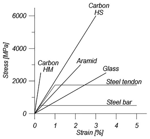 Vlákna pro vnitřní FRP výztuže se používají nejčastěji skleněná nebo uhlíková, na trhu jsou i vlákna čedičová. Skleněných i uhlíkových vláken je celá řada typů; liší se jak fyzikálními, tak i chemickými vlastnostmi; pracovní diagramy vláken a kovových výztuží jsou schematicky zakresleny na Obr. 1 a Obr. 2.
