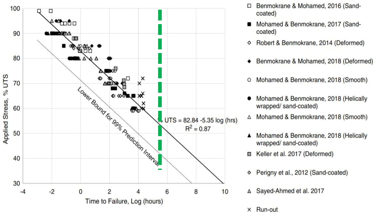 Obr. 4: Závislost životnosti GFRP výztuže na hladině dlouhodobě působícího zatížení vyjádřená v hodinách (v log měřítku), 106 hodin = cca 114 let, [7]