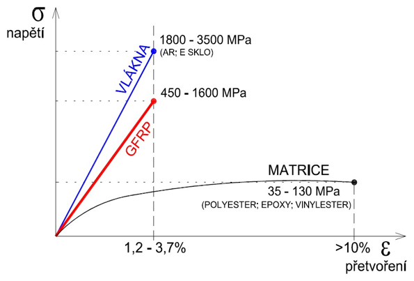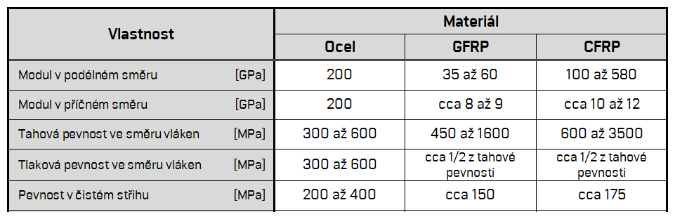 Základní krátkodobé mechanické vlastnosti FRP výztuže (a jejich srovnání s klasickou kovovou výztuží) jsou uvedeny v Tab. 1.