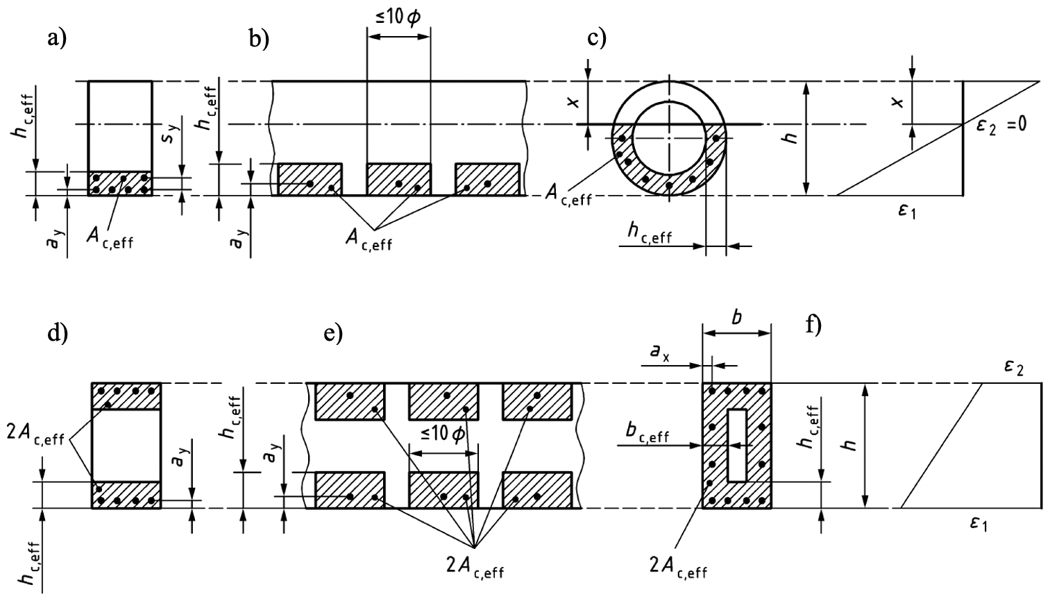 Obr. 11: Efektivní tažená plocha betonu Ac,eff . Legenda: a) až c) dominantní ohybové namáhání (část průřezu tlačená, část tažená); d) až f) dominantní namáhání normálovou silou (celý průřez tažený); a) výztuž v tažené oblasti, skupina prutů; b) „řídká“ výztuž v tažené oblasti, samostatné pruty; c) kruhový průřez; d) výztuž umístěna u horního a dolního okraje průřezu; e) „řídká“ výztuž v tažené oblasti, samostatné pruty; d) pruty umístěny po celém obvodu průřezu