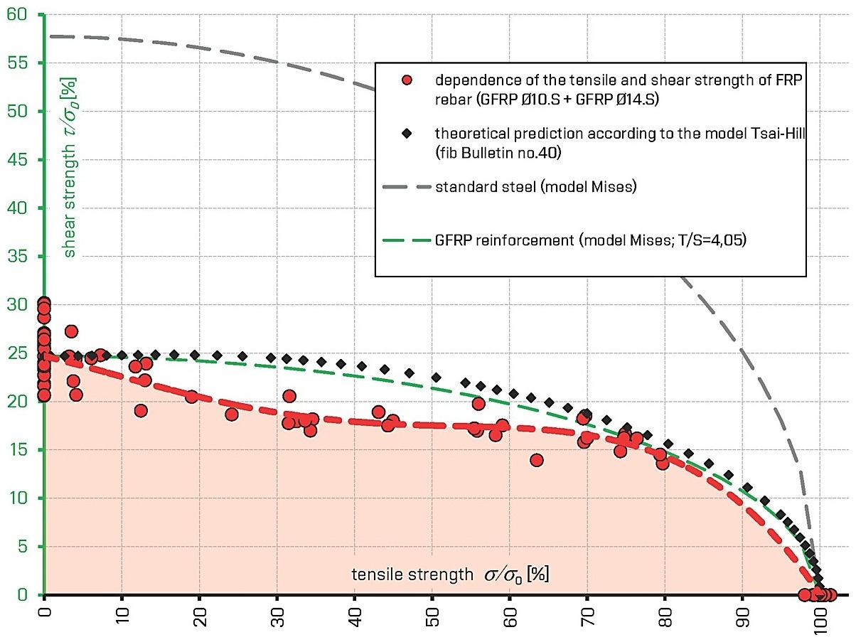 FRP výztuž vykazuje odlišné chování při jejím namáhání ve směru vláken a kolmo na vlákna, což bývá někdy při praktických výpočtech modelováno pomocí von Misesova kritéria, viz Obr. 3. Červeně jsou znázorněny naše výsledky a jejich aproximace pro konkrétní GFRP výztuž, kterou jsme na FAST VUT v Brně – v rámci řešení výzkumných úkolů MPO a TAČR – spolu s Prefou kompozity Brno vyvinuli a která je k dostání na našem trhu se stavebními materiály.