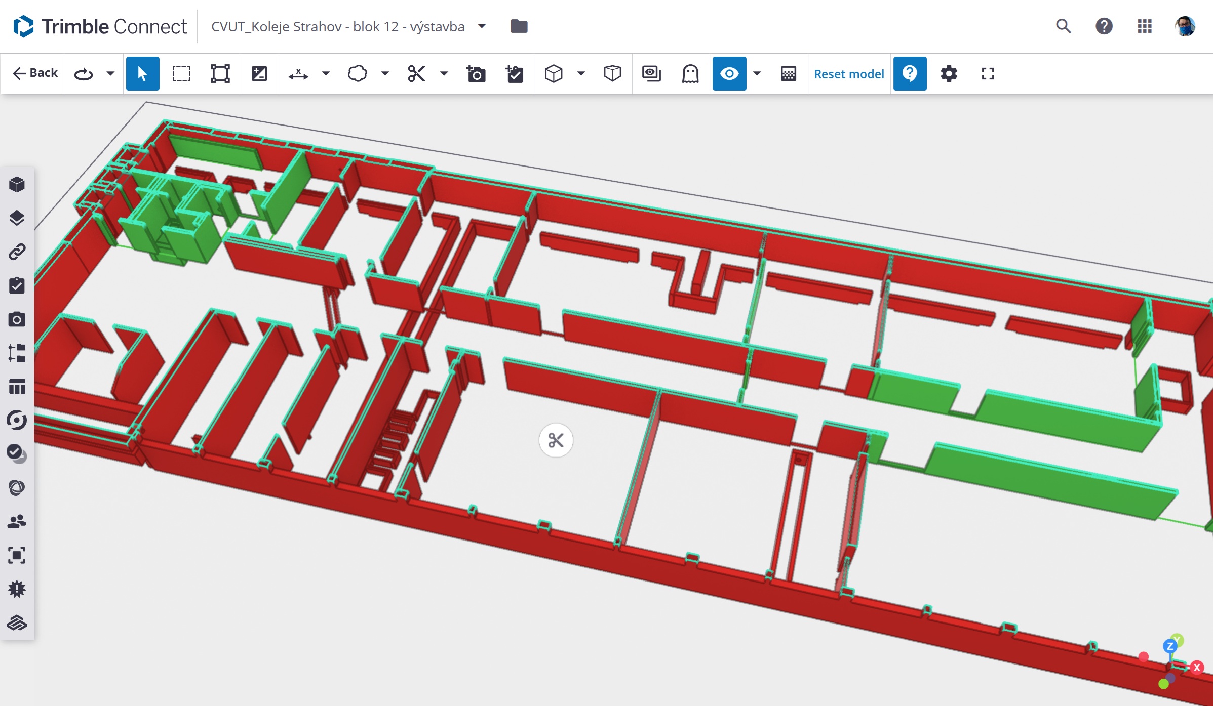 V současné době je projekt přerušen z důvodu zjištění odhalených výztuží na nosných konstrukcích. Únosnost stropů je tím oslabena a projekt musí být přepracován. I v takto obtížné situaci se ukazuje, jak BIM přístup ČVUT pomohl. Za normálních okolností by se projekt přepracovával minimálně půl roku. V případě metody BIM šlo využít již hotového modelu, upravit ho podle skutečností zjištěných na stavbě a rychle navrhnout nové řešení. Doba, po kterou musí investor platit „přerušenou“ stavbu, se tak zkracuje na polovinu.