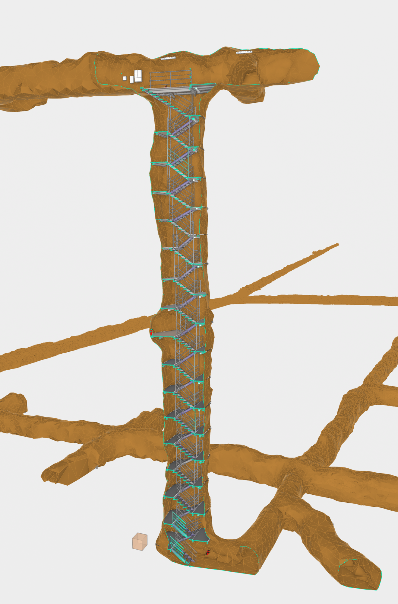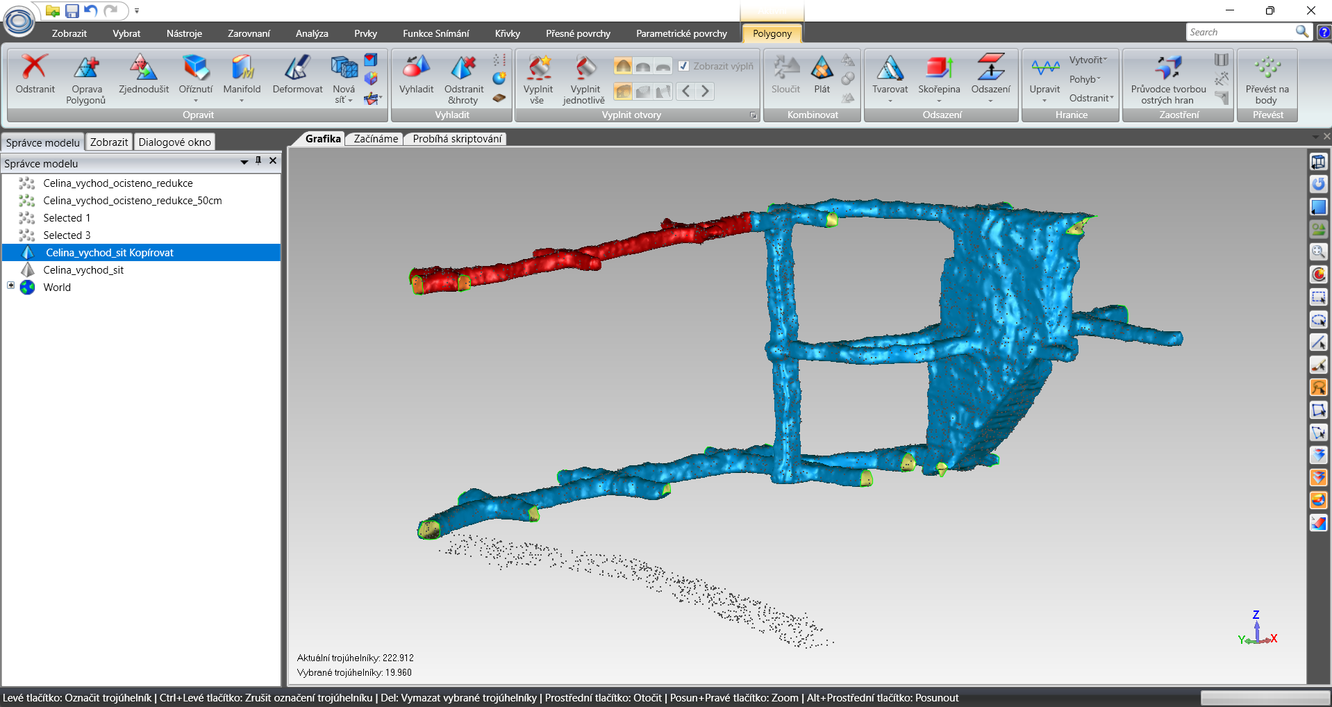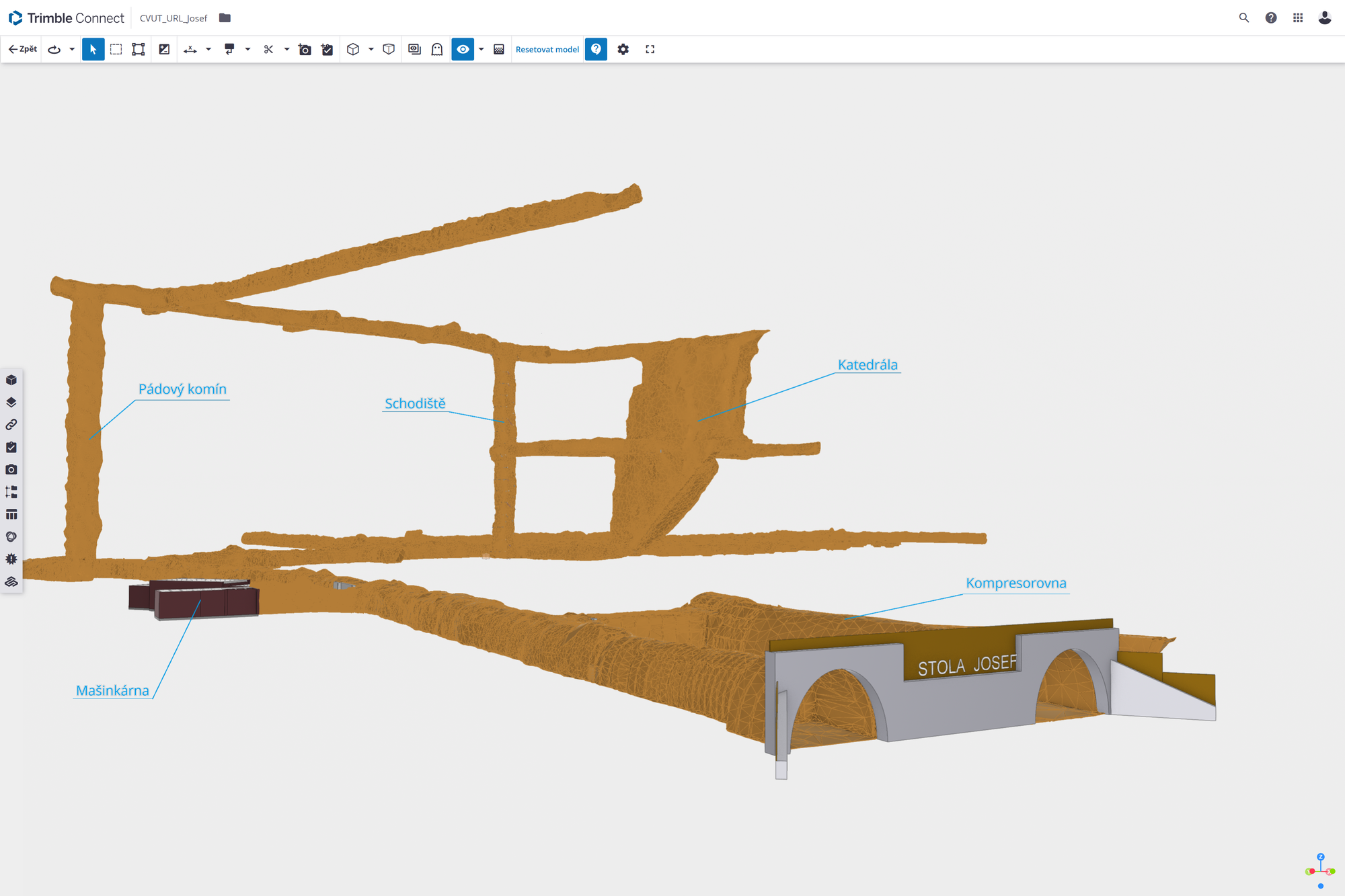 Prvky obvyklé pro klasické pozemní stavitelství byly modelovány nástrojem Revit – světla, vypínače, rozvodné skříně, přenosná hasicí zařízení, potrubní systémy, záporové stěny, nosníky, schodiště. Štoly, resp. rozrážky byly modelovány jako polygonální sítě ve třech různých úrovních detailu. K nim byla využita kombinace nástrojů – Cloud Compare (Obrázek 1 – CloudCompare), MeshLab, AutoCAD a Geomagic Wrap (Obrázek 2 – Geomagic wrap). Mračna bodů byla nejdříve vyčištěna, byla provedena kontrola jejich geolokace. Následně byly odebrány body modelovaných prvků (např. stavební konstrukce) tak, aby zůstala pouze plocha styku horniny a rozrážky/štoly. Odebrané body modelovaných prvků se později použili k jejich přesnému umístění.