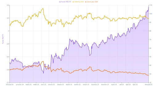 Na velkoobchodních trzích se dál rozevírají cenové nůžky mezi elektřinou a zemním plynem. Zatímco před rokem stála jedna megawatthodina elektřiny zhruba 2,5× více než v plynu, dnes se tento poměr pohybuje už kolem 3,4×. Trend posledních měsíců je jednoznačný – elektřina zdražuje významně rychleji.