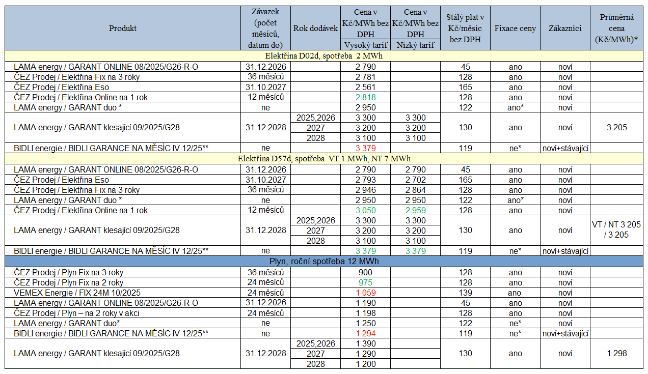 Tab. 2: Přehled nových ceníků za uplynulý týden (zeleně – nižší cena než u předchozího srovnatelného ceníku, červeně – vyšší cena, * – produkt v zimě s fixní cenou, v létě s měsíčním fixem, ** – měsíční fix)