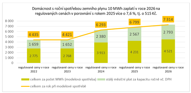 Podle návrhu zaplatí v roce 2026 domácnost s roční spotřebou zemního plynu 10 MWh o 515 Kč, tedy o 7,6 % více než v roce 2025.