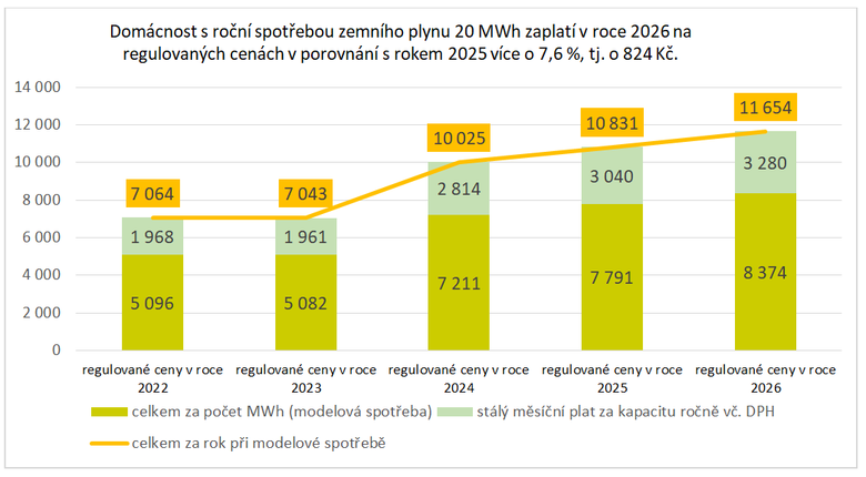 Podle návrhu zaplatí v roce 2026 domácnost s roční spotřebou zemního plynu 20 MWh o 824 Kč, tedy o 7,6 % více než v roce 2025.