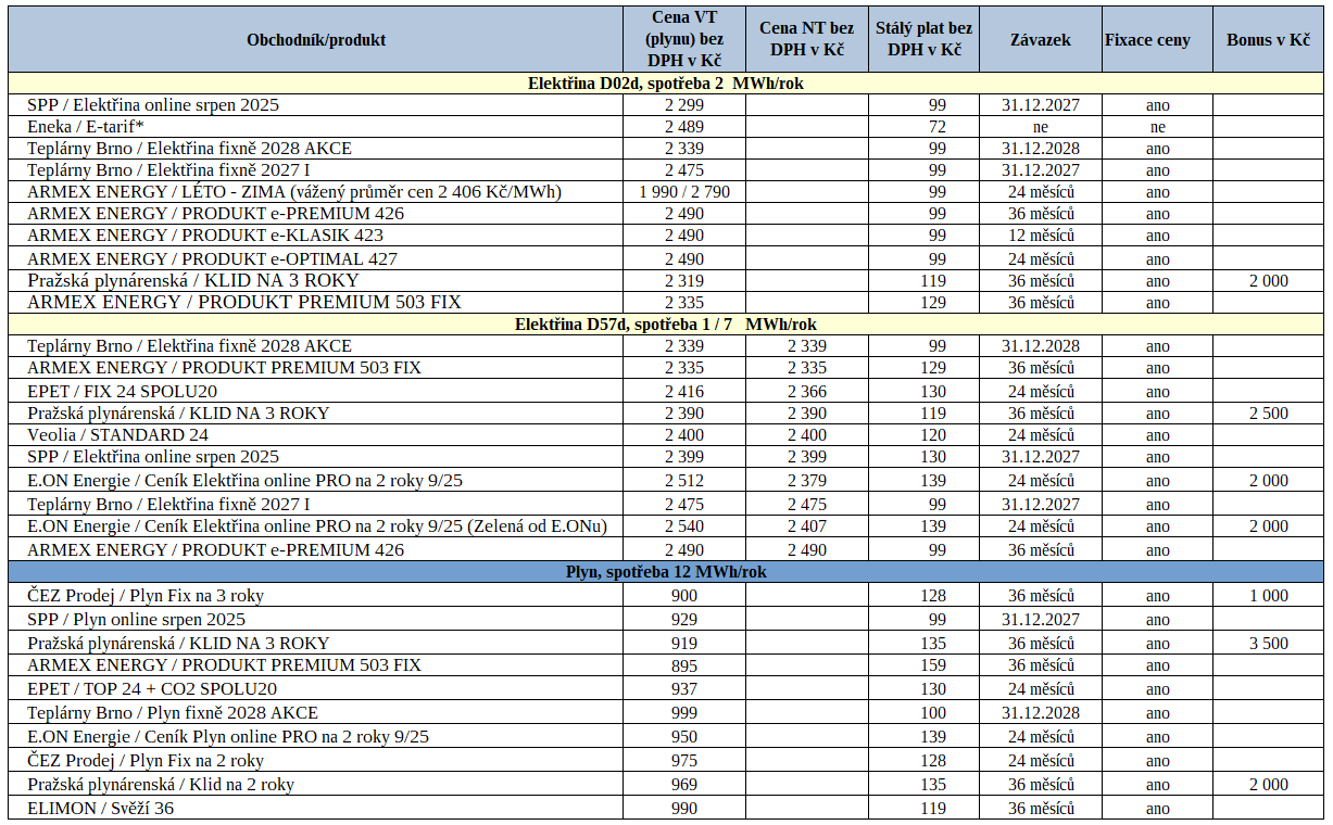 Pořadí nabídek je podle výše ročních nákladů bez ohledu na obchodníky poskytnuté bonusy. Nabídky s bonusy mohou posunout výhodnost voleb takových tarifů do čelních pozic.