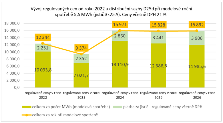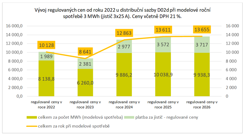 Na distribučním území ČEZ Distribuce u nejběžnější distribuční sazby D02d dojde k mírnému snížení ceny za megawatthodinu a zvýšení fixního platu, který známe jako platbu za jistič. Při modelové roční spotřebě 3 MWh vzrostou náklady za celý rok pouze o 44 Kč. Cenový růst tak představuje 0,3 %.