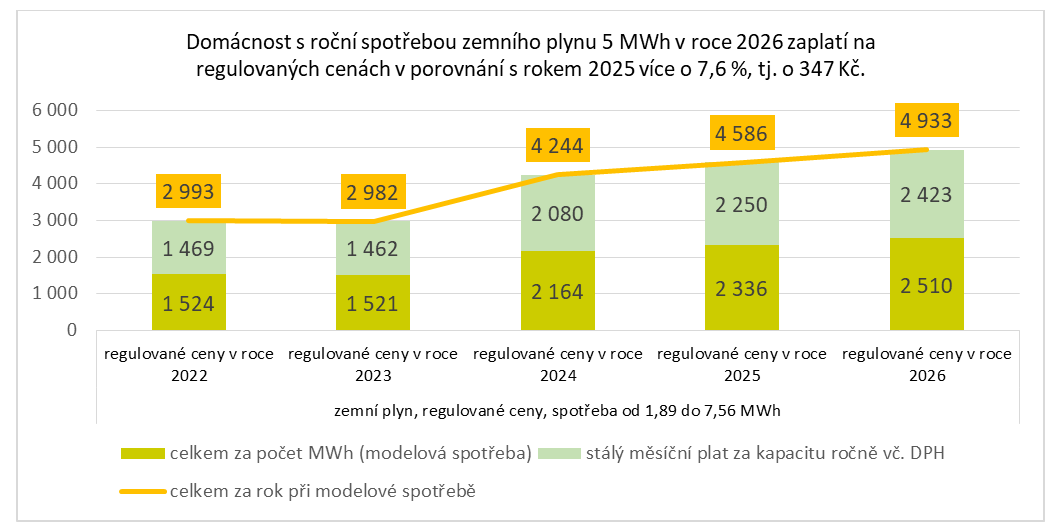 Podle návrhu zaplatí v roce 2026 domácnost s roční spotřebou zemního plynu 5 MWh o 347 Kč, tedy o 7,6 % více než v roce 2025.