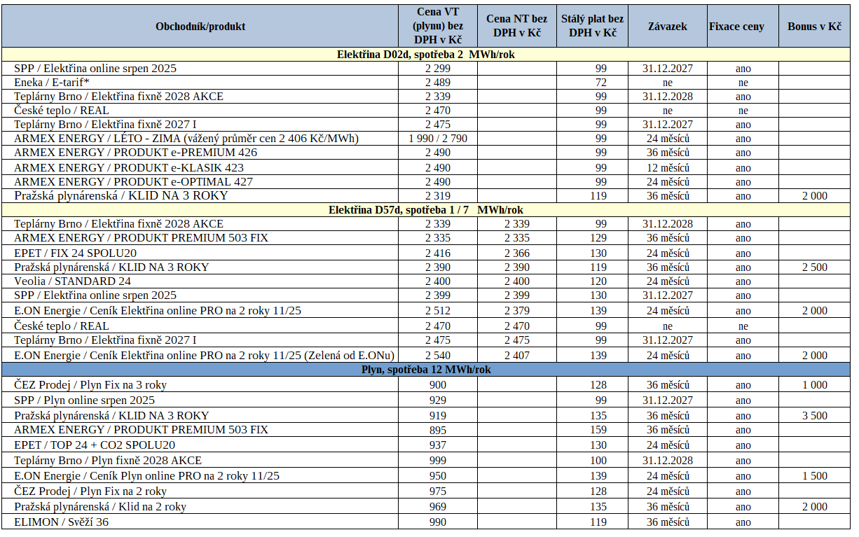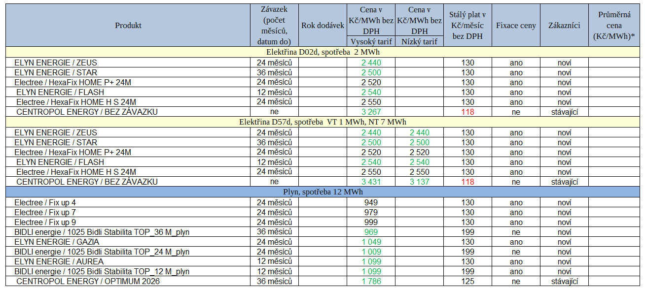 Tab. 1: Výběr z novinek na energetickém trhu pro domácnosti za uplynulý týden (zeleně – zlevnění proti minulé verzi, červeně – zdražení.