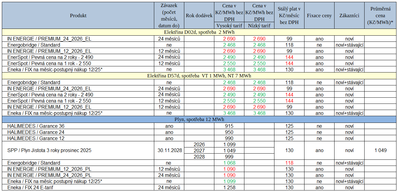 Tab. 1: Přehled nových ceníků za uplynulý týden (červeně – růst cen, zeleně – pokles cen proti poslední verzi ceníku, * – měsíční tarif)