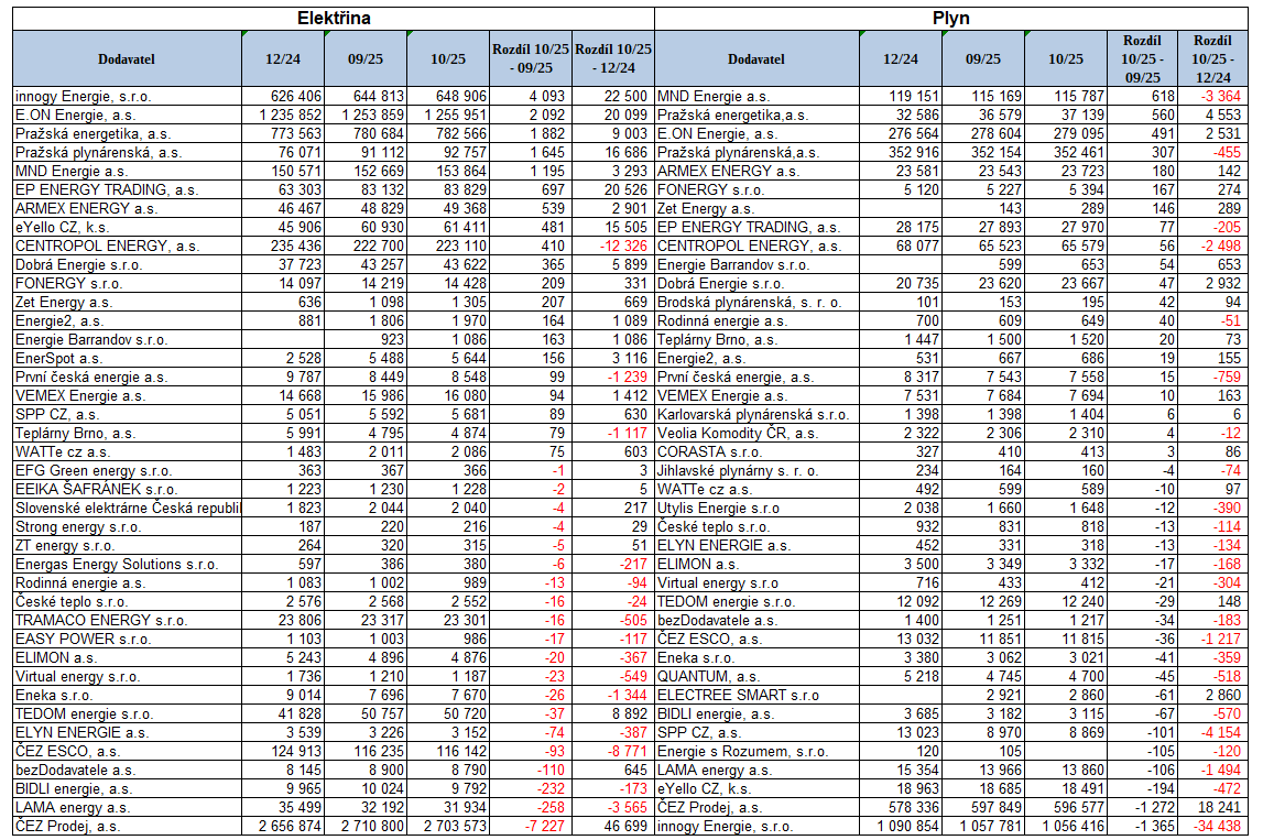 Operátor trhu zveřejnil počty odběrných míst podle jednotlivých dodavatelů. Porovnáním nových údajů se stavem v měsíci září a se stavem ke konci minulého roku jsem zjistil, jak který dodavatel si vede. Z dodavatelů byli vybráni jenom známí dodavatelé z Kalkulátoru cen energií TZB-info, neuvádím zde počty přípojek u lokálních provozovatelů sítí nebo u podnikových odběrných míst.