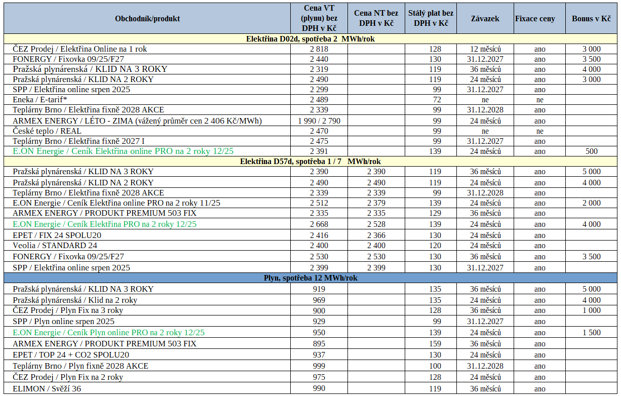 E.ON Energie po měsíci aktualizovala nabídky pro nové zákazníky, které se u tarifu určeného ke sjednání na internetu (online PRO) liší pouze označením části názvu, který se změnil z 11/25 na 12/25. U nabídky Variant PRO na 2 roky ale obchodník mírně zvýšil cenu obou komodit o 50 Kč/MWh. Tyto ceny jsou částečně vykompenzovány finančním bonusem, s tím, že online varianta se pojí s nižším bonusem, než tarif Variant PRO na 2 roky, který je o poznání dražší. Produkt Komplet elektřina (plyn) MAX PRO na 3 roky nahradil nabídku s postupně klesající cenou. Obchodník v ní mimo výhodné ceny nabízí servisní služby v ceně energií.