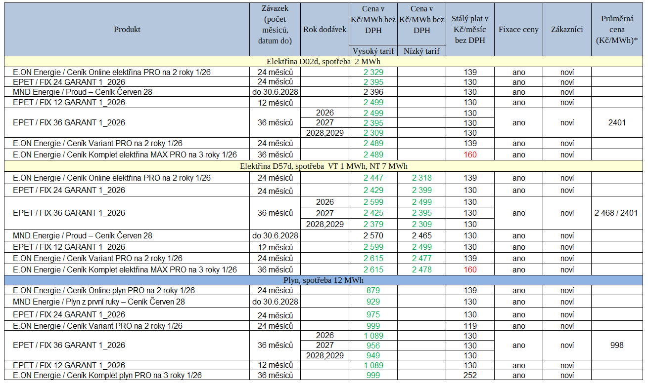 Tab. 1: Přehled nových ceníků za uplynulý týden (zeleně – pokles ceny, červeně – růst ceny proti předchozí verzi, * – vážený průměr cen u produktů se stupňovitou cenou)