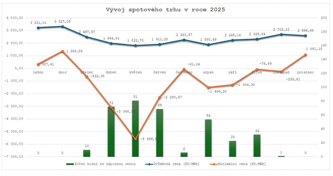 Spotový trh s elektřinou v roce 2025: více záporných hodin, přesto meziročně o 15 % dražší