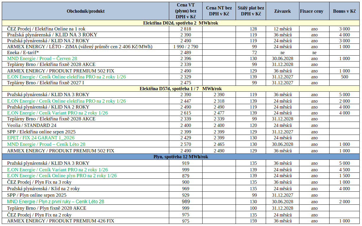 Tab. 2: Přehled nejvýhodnějších nabídek ke sjednání novými zákazníky (zeleně – novinky na trhu)