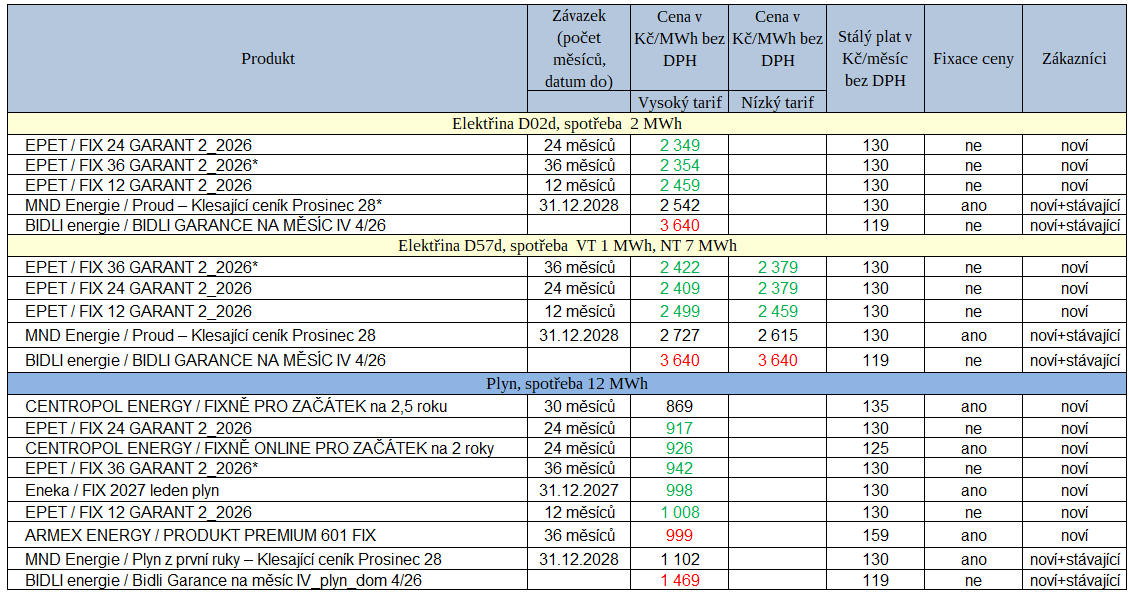 Tab. 2 Přehled nejvýhodnějších nabídek na trhu s elektřinou a s plynem za poslední týden (zeleně – novinky, * je pro zákazníky se spotřebou do 3 MWh/rok)