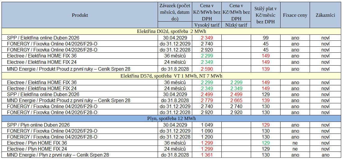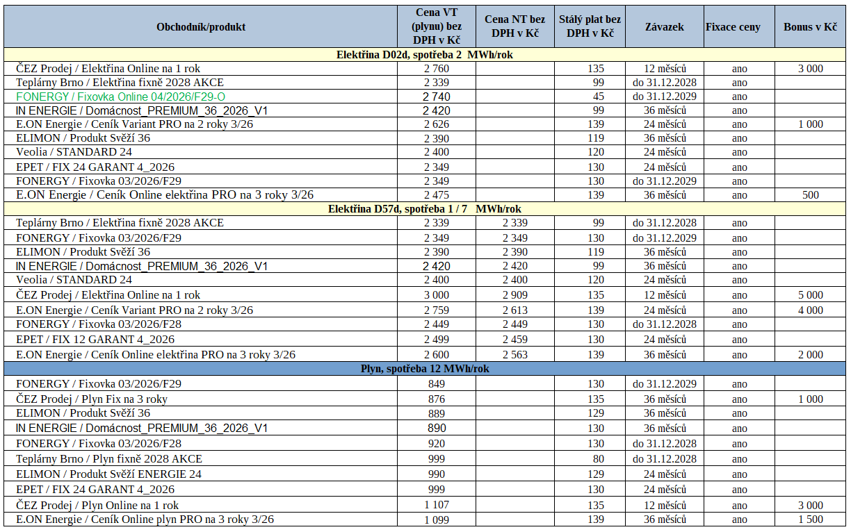 Sice ceny za dodávky energií pomalu rostou, ale přesto si lze stále vybrat výhodnou nabídku a ušetřit tak, proti minulým rokům. Situace ve světě je ale nejistá, tyto výhodné nabídky nemusí trvat věčně. V následující tabulce jsou výhodné nabídky, které je ale potřeba si ověřit, protože je dodavatelé nyní velmi rychle mění. Toto doporučení je platné pouze do vydání nového článku s aktualizovanou nabídkou. Ještě prosím zvažte, zda se vyplatí cenově nižší produkt s kratší fixací nebo o něco dražší s fixací na delší dobu.