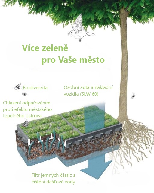 Důležitou vlastností zasakovacích roštů AS-TTE je jejich plná propustnost pro vodu. Zatímco klasická dlažba umožňuje vsakování pouze skrze spáry, zde může dešťová voda přirozeně pronikat celým povrchem. Voda tak zůstává v místě dopadu a obohacuje půdní profil o vláhu, kterou stromy potřebují. Systém tím přispívá k přirozené vodní bilanci území a zároveň snižuje riziko přetížení kanalizace při přívalových deštích.