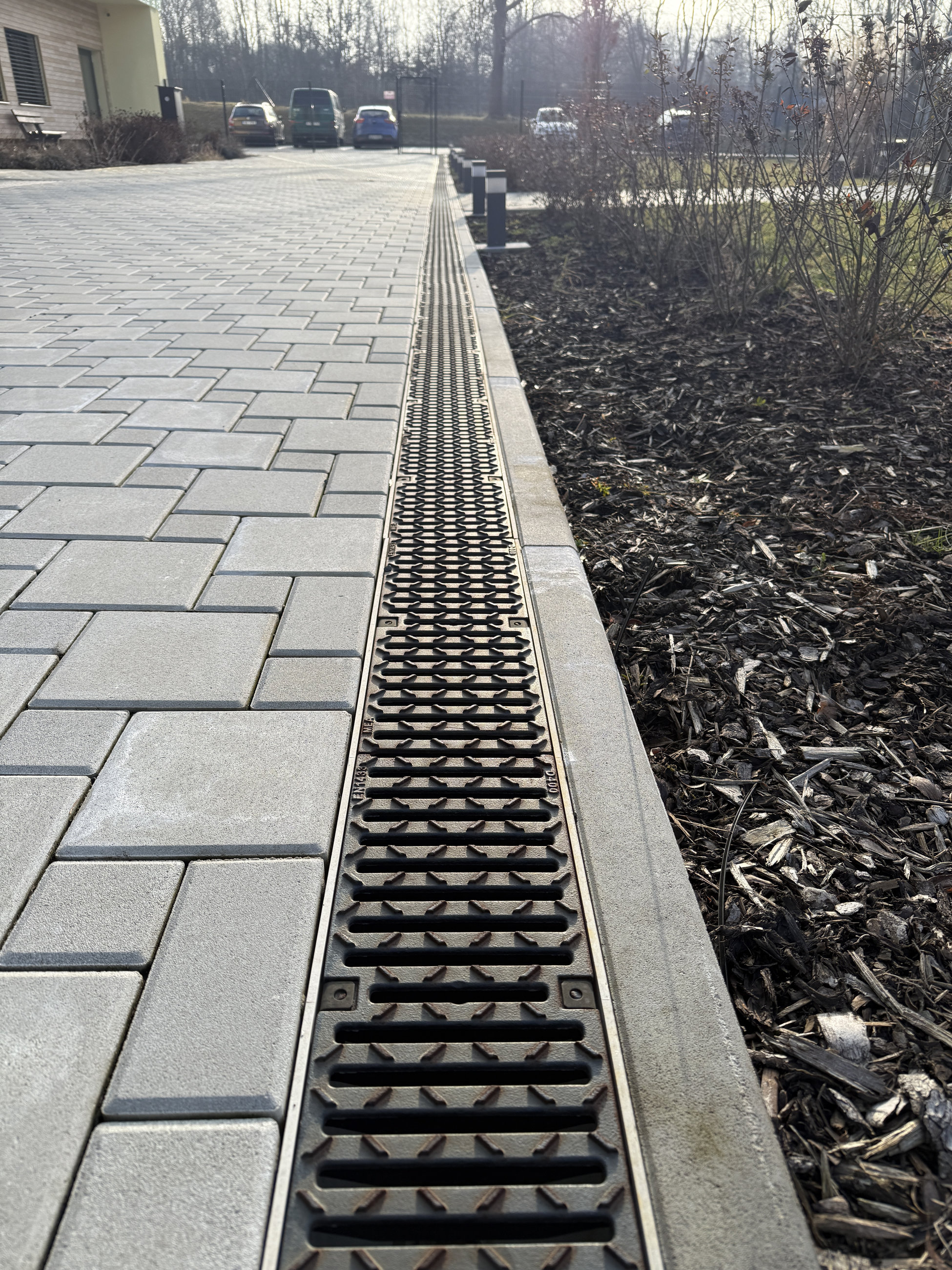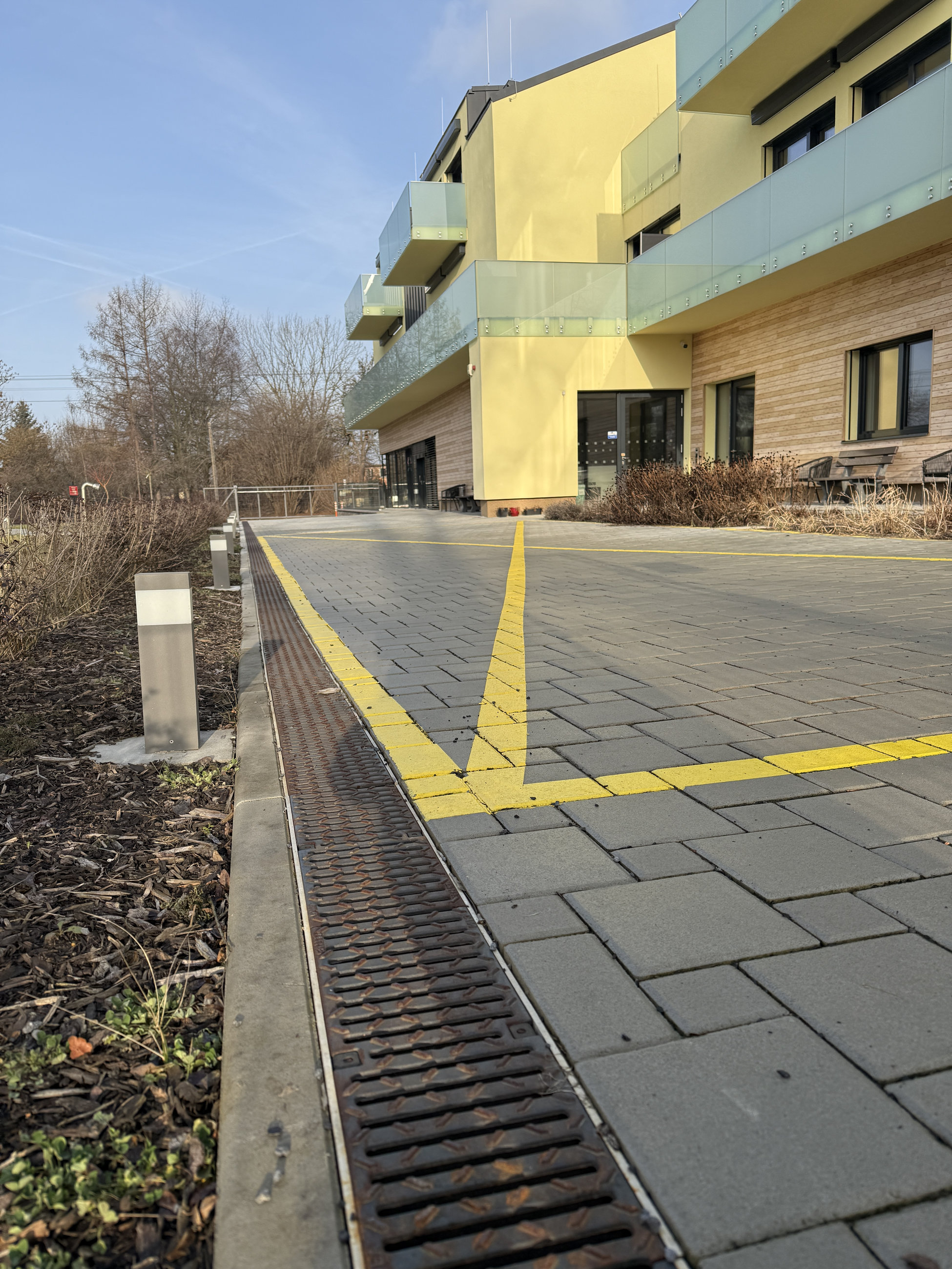 Pro řešení odvodnění zpevněných ploch v okolí budovy byly použity odvodňovací žlaby systému MEADRAIN EN z polymerického betonu, které jsou navrženy tak, aby bezpečně odváděly dešťovou vodu i v místech s vyšším zatížením.