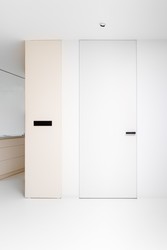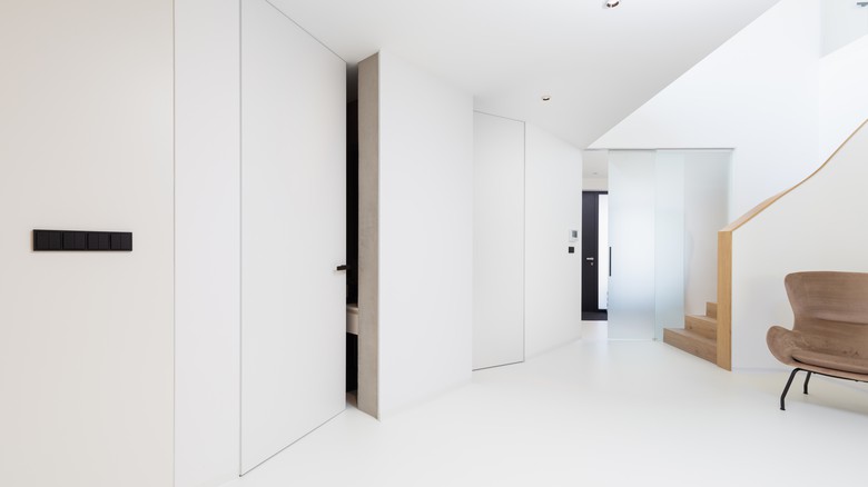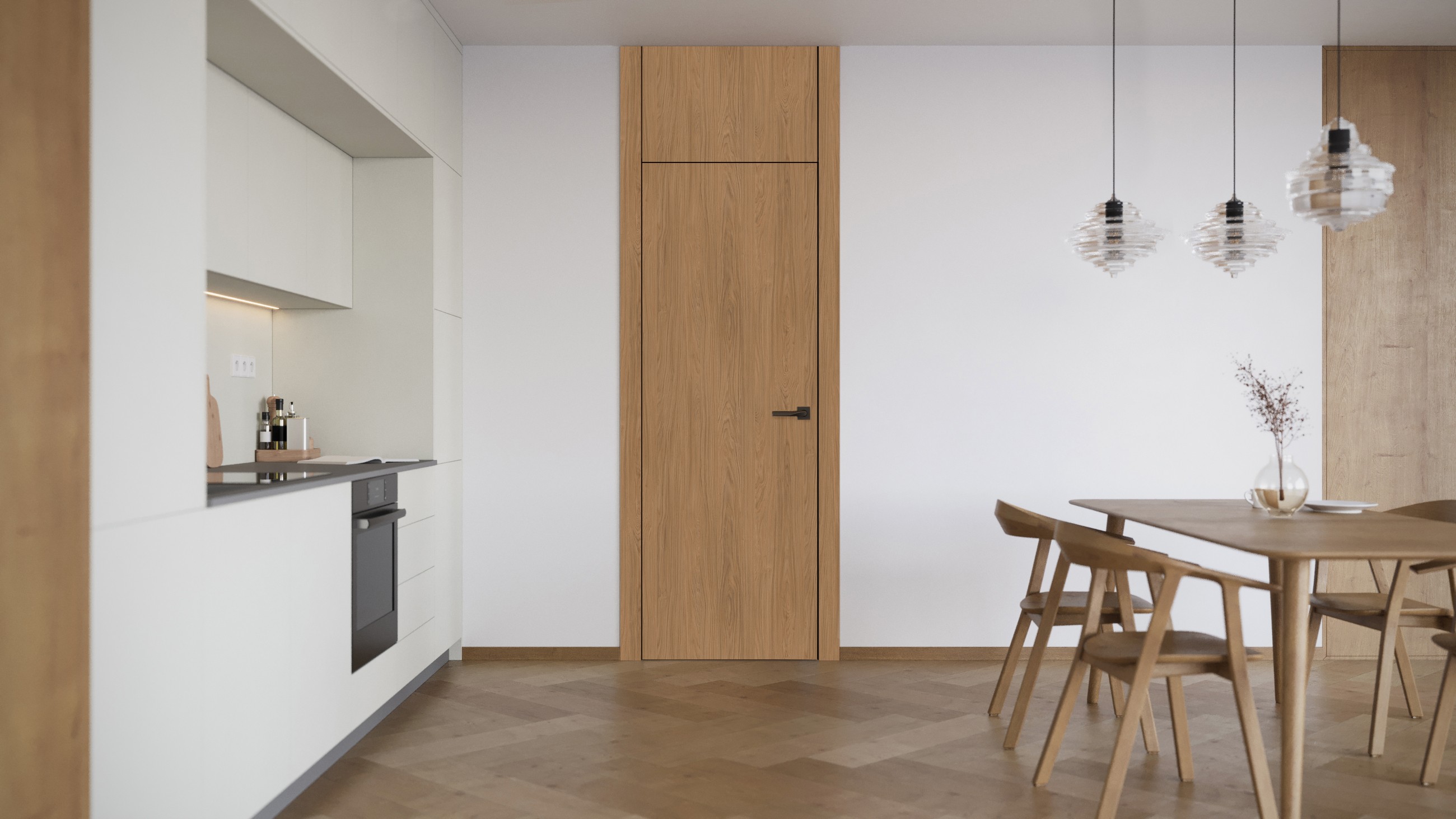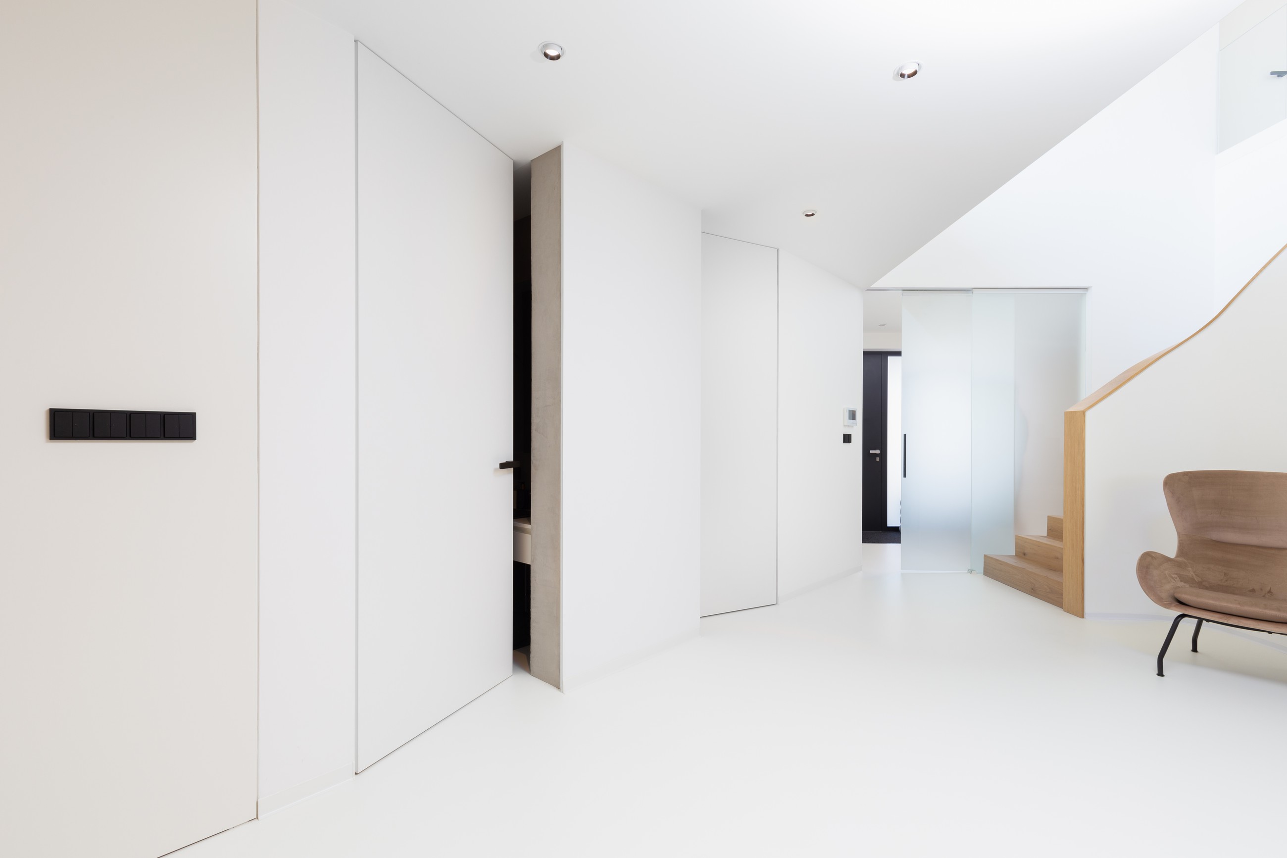 • Nejčastěji v kombinaci se skrytými zárubněmi, nahoře u stropu už není žádný rám či obložka, pouze křídlo a stěna.