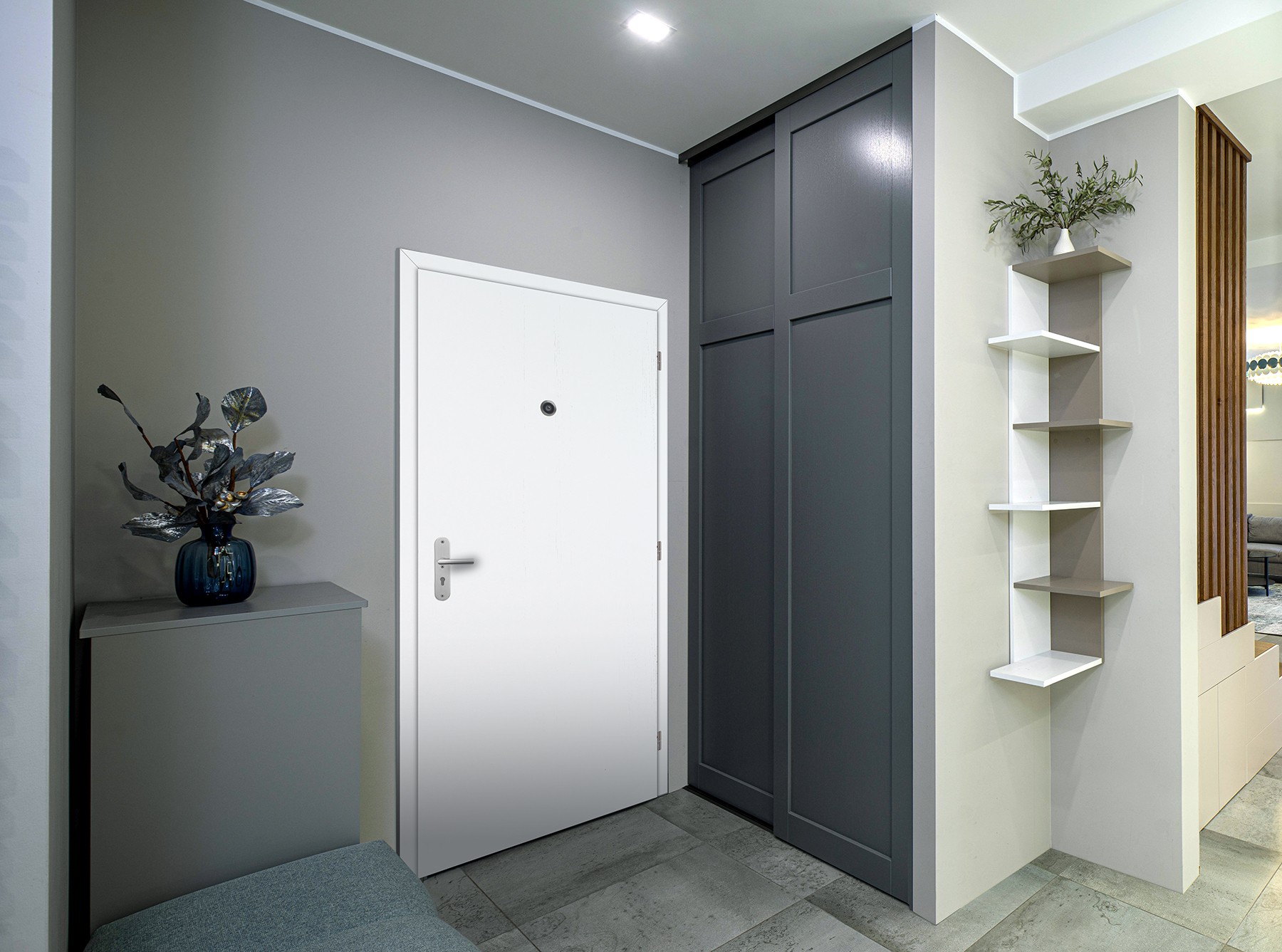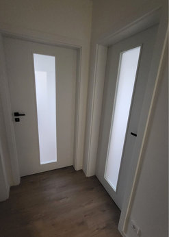 Pro dveře do technického zázemí zvolil bílé provedení, které na sebe nepoutá zbytečnou pozornost a přirozeně splývá s okolními stěnami. „Obyčejnější provedení v bílé barvě jsme zvolili do technického zázemí, aby příliš nevystoupily z okolních bílých stěn,“ doplňuje Pavel Suk. Právě tato schopnost kombinovat výrazné designové vstupy s nenápadnými, funkčními prvky umožnila dosáhnout vizuálně harmonického standardu moderního bydlení.