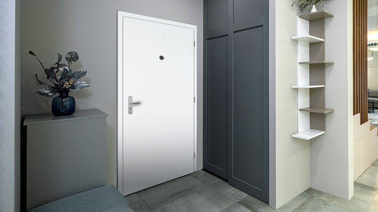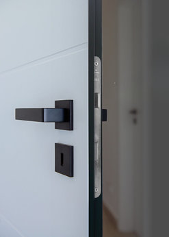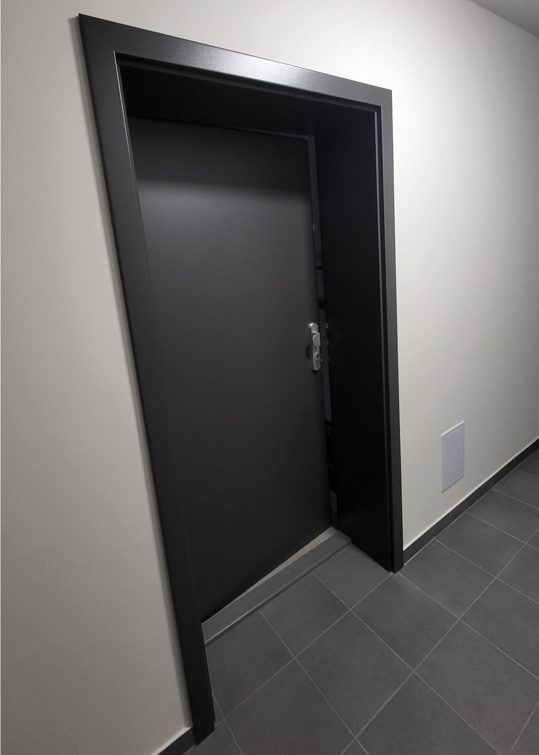 „Při navrhování projektu našich typových domů Trio jsme museli použít protipožární dveře pro vstupní dveře do bytů, do skladových místností a do kotelny," popisuje Pavel Suk a dodává: „U vstupních dveří do bytů jsme zvolili variantu s lepší akustickou izolací v antracitovém provedení.“