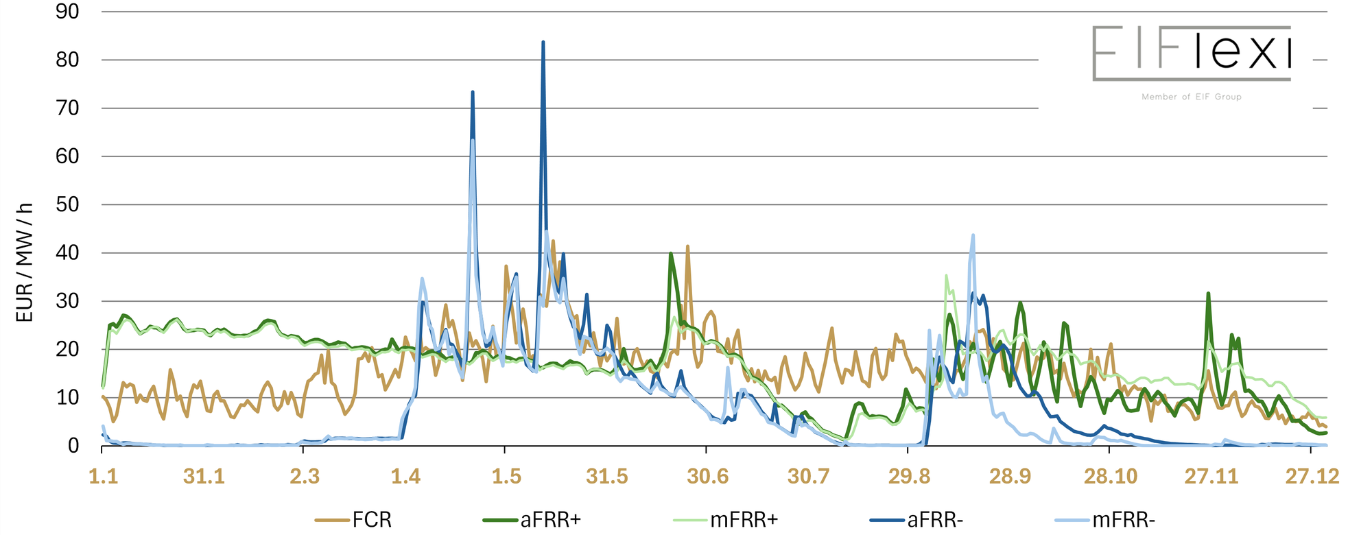 Rok 2025 potvrdil pokračující pokles cen na trhu se službami výkonové rovnováhy. Služba aFRR+, která je pro řadu subjektů tou nejatraktivnější, meziročně poklesla o 34 %, přičemž průměrná cena za rok 2025 dosáhla úrovně 16,2 EUR/MW/h. Vývoj trhu s aFRR byl ovlivněn zářijovým vstupem do mezinárodního mechanismu ALPACA, tedy společného trhu rezervovaného výkonu s Německem a Rakouskem. Podobný pokles zaznamenala i mFRR, která se vyznačuje nižší mírou aktivací a průměrné hodnoty se pohybovaly na úrovni 16,8 EUR/MW/h. U primární regulace (FCR) se celoroční průměr snížil na 15,3 EUR/MW/h, což představuje meziroční pokles přibližně o 40 %.
