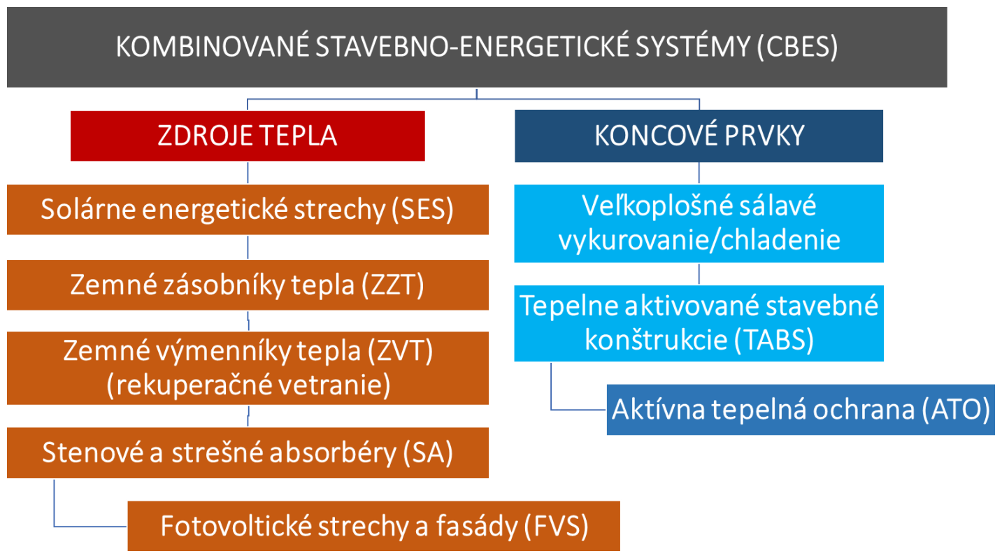 Stavebné konštrukcie s integrovanými energeticko-aktívnymi prvkami vo všeobecnosti nazývame kombinované stavebno-energetické systémy (CEBS - combined building-energy systems), ktoré majú energetickú funkciu zdroja tepla, koncových prvkov alebo sú kombinované, [2–9], obr. 1.