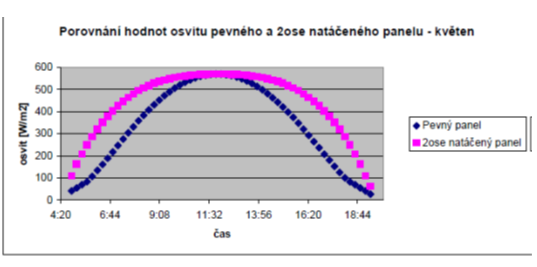 Graf dokumentující nižší efektivitu střešních instalací FVE