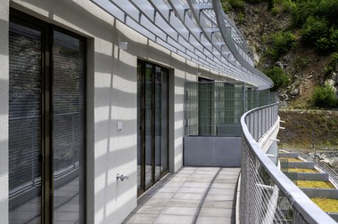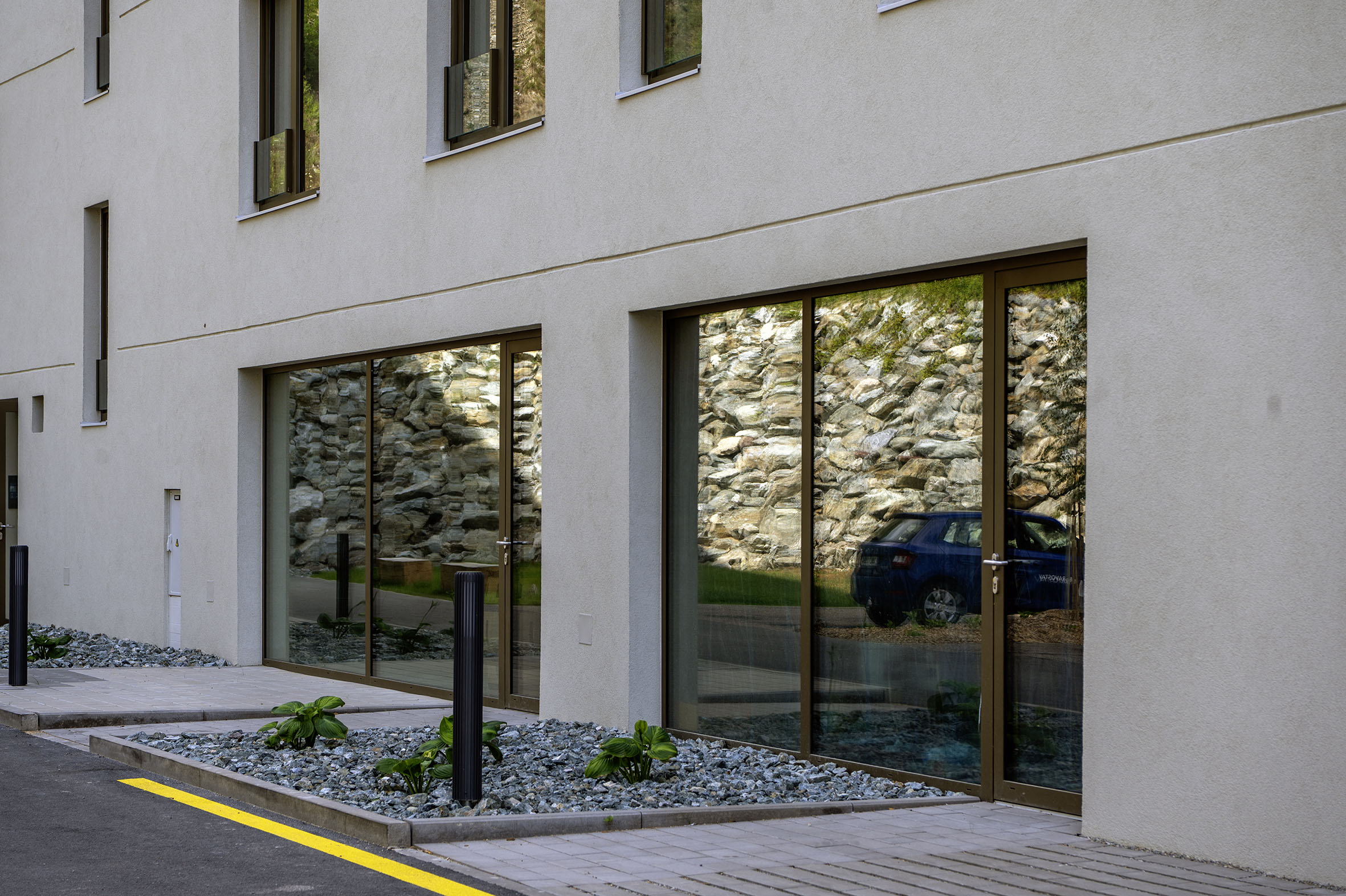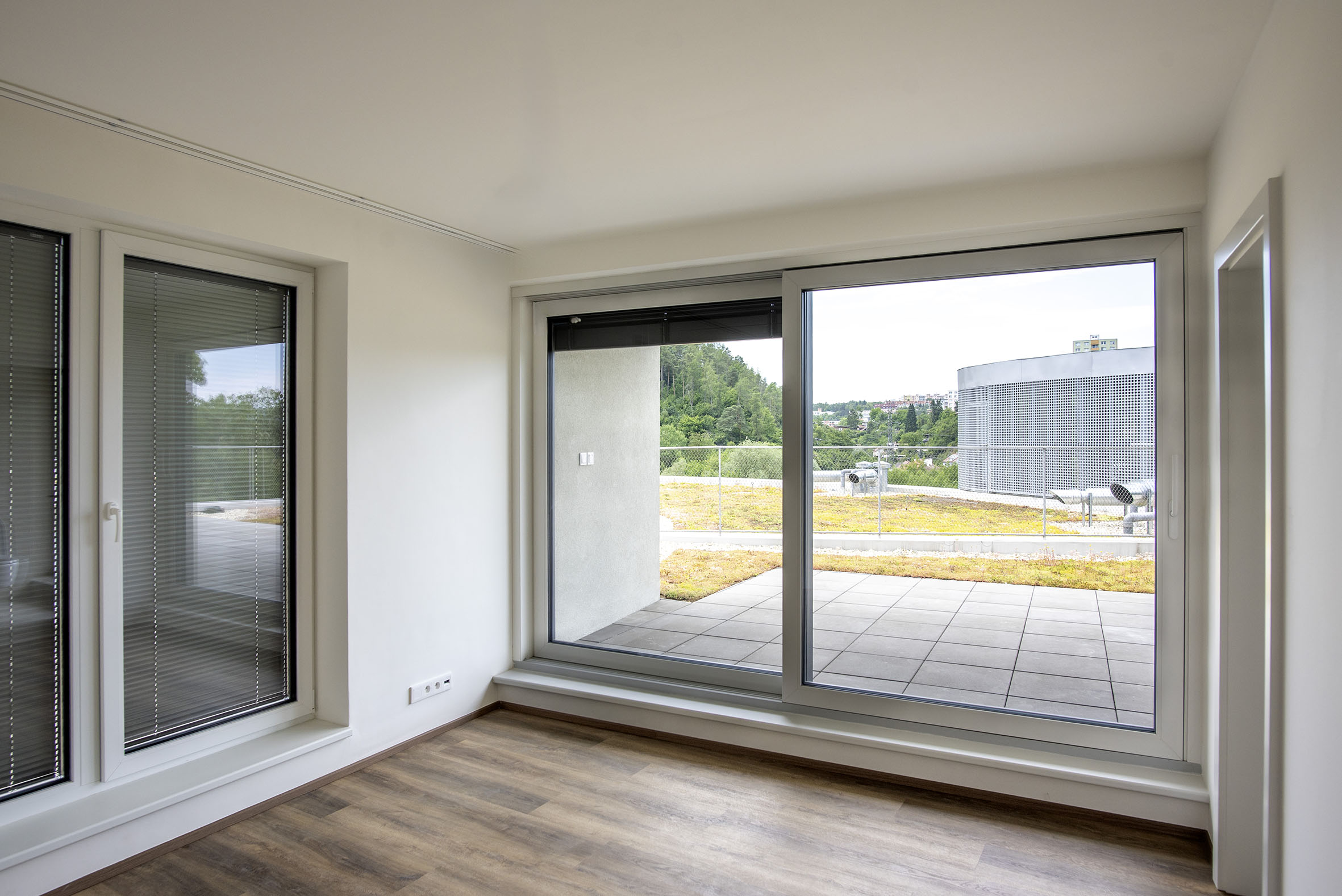 Významnou roli v celém projektu DIORIT sehrála okna, která určují nejen charakter fasády, ale také kvalitu života uvnitř bytů. Už od začátku byl kladen maximální důraz na technickou vyspělost, špičkové tepelně-izolační vlastnosti a prémiový design. Specifickým požadavkem investorů byly i předokenní žaluzie nabízené jako nadstandardní vybavení. A právě zde se projevil jeden z největších konstrukčních oříšků – půdorysně obloukový tvar budovy. Klasické podomítkové kastlíky nebylo možné použít, a to jak kvůli nevhodné geometrii, tak kvůli riziku vzniku tepelných mostů. Řešení nakonec přinesly kompozitní okenní systémy REHAU (PROGRESS – výrobce DAFE-PLAST Jihlava) s hliníkovou obložkou ALU EF+, které umožňují plně integrované venkovní stínění bez nutnosti podomítkových schránek. Veškeré prvky jsou součástí samotného okna, což výrazně zjednodušilo montáž a zároveň přineslo čistší, elegantnější vzhled celé fasády. Ve štítových stěnách byly navíc instalovány velkoformátové HS portály z téhož kompozitního materiálu, dosahující až 10 metrů délky. I u těchto prvků se podařilo udržet vysokou energetickou efektivitu s hodnotou Uw = 0,88 W/m2K. Pro zajištění maximální tepelné stability byla okna ve vnitrobloku instalována v plně předsazené systémové montáži DAFE PUREX BASIC, u uliční fasády a štítů pak v polopředsazené variantě s vysazením o 30 mm. Tím se eliminovaly možné tepelné mosty a zároveň se podařilo přizpůsobit montáž specifickému obloukovému tvaru objektu.