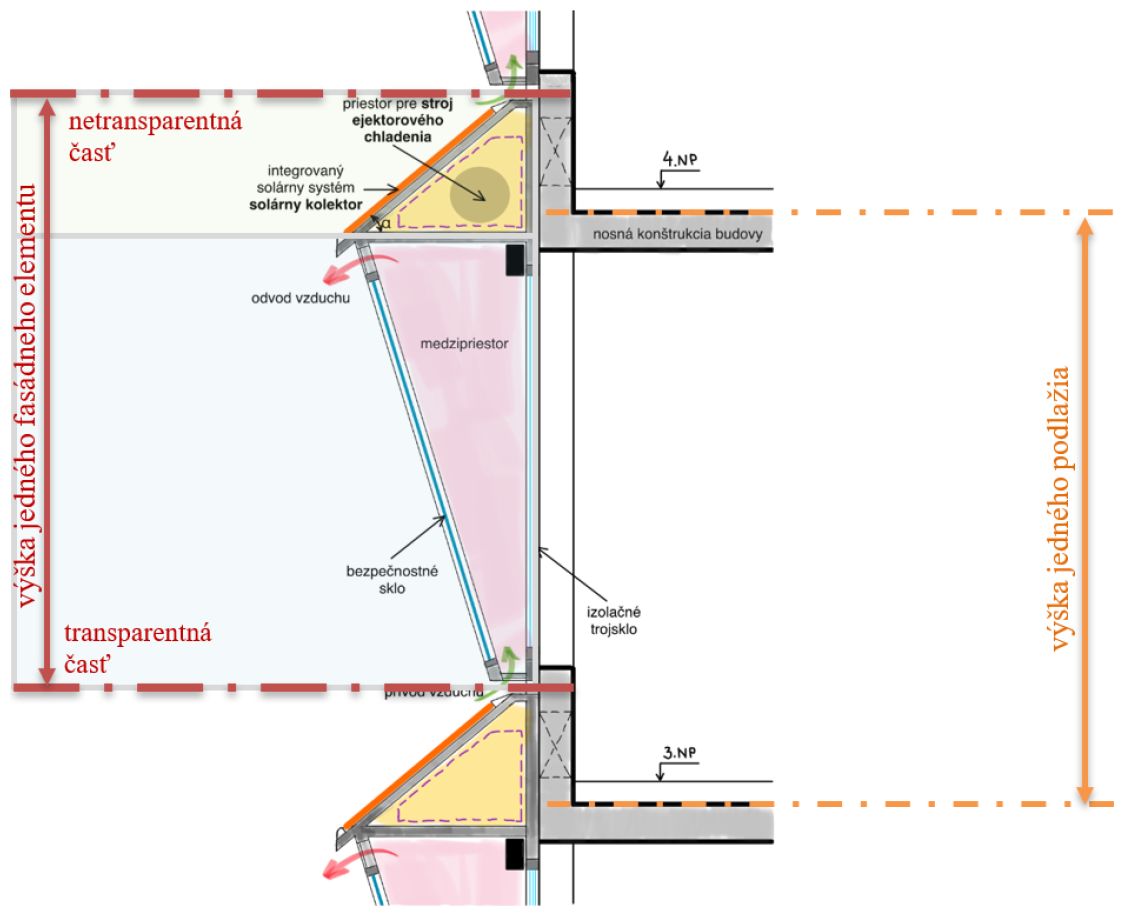 Základným konceptom nového návrhu je dvojitá transparentná fasáda (Obr. 1, Obr. 2), ktorá je schopná reagovať a prispôsobiť sa podmienkam meniacej sa vonkajšej klímy. Zároveň by nemala negatívne vplývať na kvalitu vnútorného prostredia budovy. Koncept novej inovatívnej adaptívnej fasády je riešený modulovo a má atypický geometrický tvar. Vonkajší plášť fasády je svojou konštrukciou a tvarom prispôsobený optimálnemu sklonu solárneho kolektora α = 40° (plochý solárny kolektor orientovaný na južnú svetovú stranu).