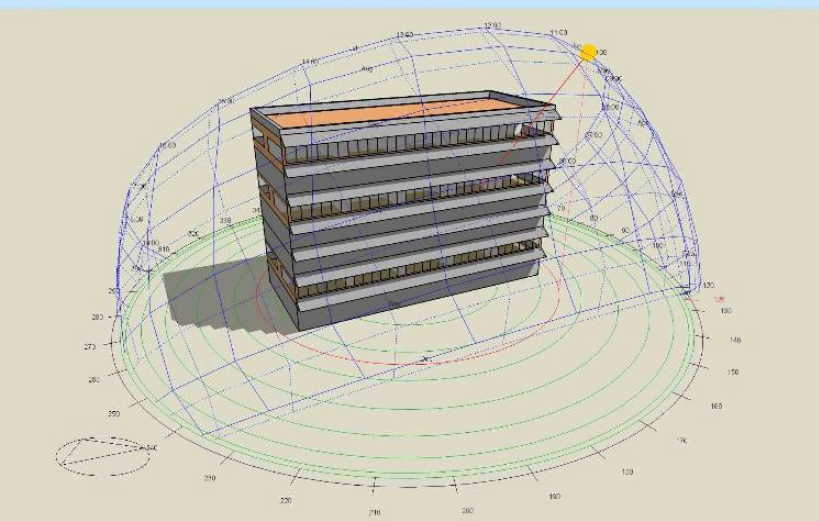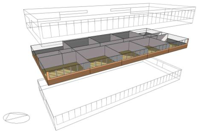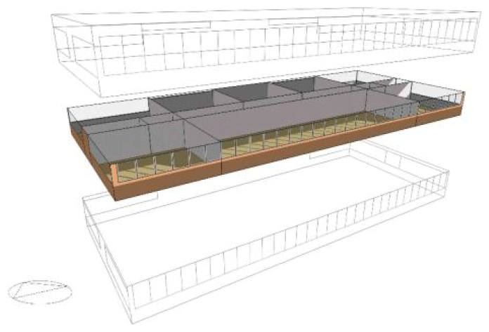 V simulačnom programe DesignBuilder bol vytvorený energetický model 7podlažnej referenčnej budovy podľa dokumentácie (Obr. 6), v štyroch variantoch. Dvojitá transparentná fasáda budovy je orientovaná na južnú svetovú stranu. Pre základný výpočet bol zadaný jednoduchý HVAC systém (bez mechanického vetrania, len s infiltráciou).