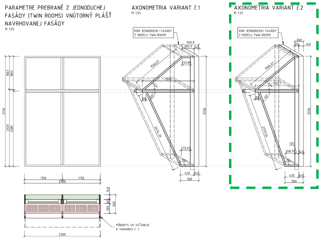 Geometria novo-navrhovanej dvojitej transparentnej fasády (DTF) vychádza z rozmerov existujúcej jednoduchej transparentnej fasády, ktorá je osadená na experimentálnom zariadení v Centrálnych laboratóriách Stavebnej fakulty STU v Bratislave – Trnávke. Vnútorný plášť novo-navrhovanej fasády je totožný s plášťom jednoduchej fasády, ktorý je tvorený dvomi oknami s integrovaným krídlom. Okná sú zasklené izolačným trojsklom AGC Glass Thermobel TG Top s vysokou fyzikálnou kvantifikáciou (súčiniteľ prechodu tepla Ug = 0,6 W/(m2.K), celková priepustnosť slnečného žiarenia g = 53 %, svetelná priepustnosť TL = 75 %, index vzduchovej nepriezvučnosti Rw = 35 dB). Horná nepriehľadná parapetná časť vnútorného plášťa fasádneho elementu je uzavretá oceľovým pozinkovaným plechom, za ktorým sa nachádza tepelnoizolačná výplň elementu z minerálnej vlny (75 kg/m3).