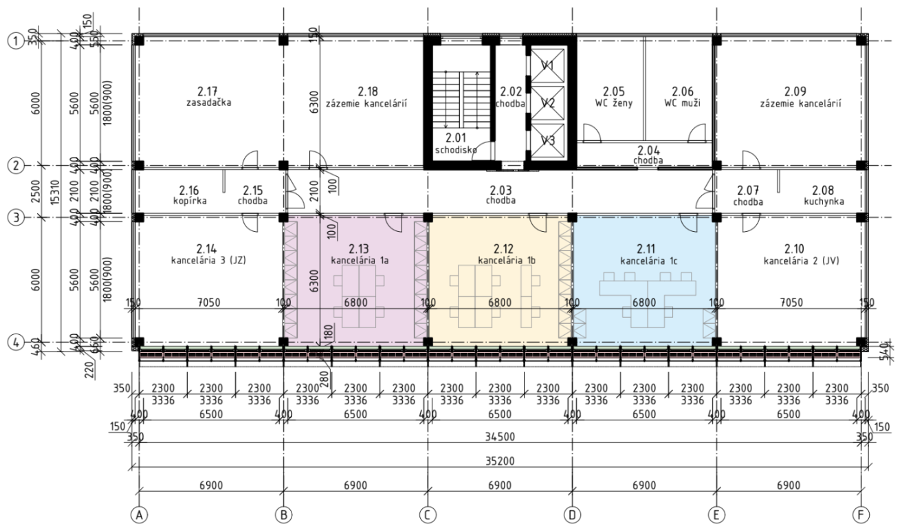 Obr. 3 V01 – schematický pôdorys typického podlažia s 3 referenčnými kanceláriami