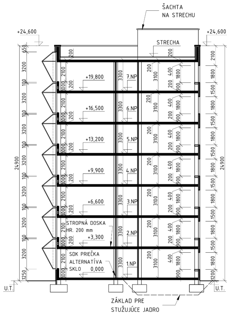 Budova je tiež navrhnutá v dvoch výškových variantoch: posudzovaný variant so 7 nadzemnými podlažiami (Obr. 5) a s 15 nadzemnými podlažiami. Variant s 15 nadzemnými podlažiami bol dodatočne vytvorený pre potreby posúdenia z požiarneho hľadiska.