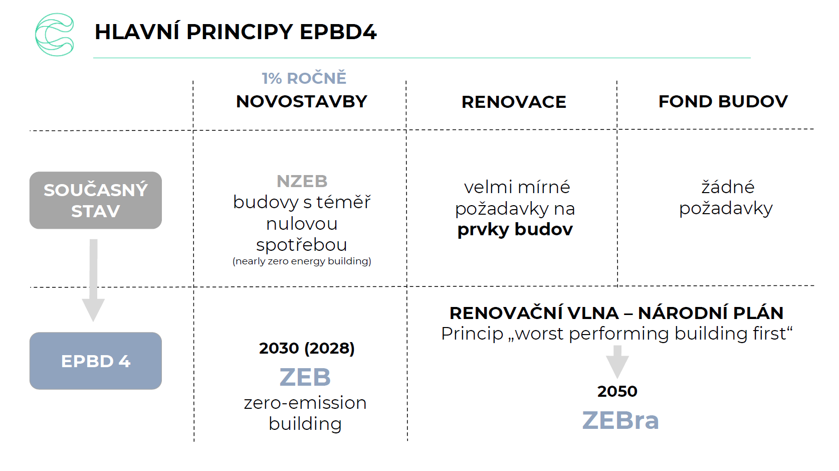 S energetickými parametry budov, požadavky a normami seznámil přítomné Jiří Cihlář ze společnosti CEVRE. Hovořil především o evropské směrnici EPBD 4, o principech energetického hodnocení, ukázal energetické modely NZEB, benchmark (vyhl. 264/2020), včetně případové studie kancelářské budovy s vlivem LOP. Zajímavý byl (kromě jiného) například výhled změn Building Directive 4 Energy Performance směrem k renovační vlně Národní plán (princip worst performing building first) a přechodu na ZEBra (zero-emission building) [4].